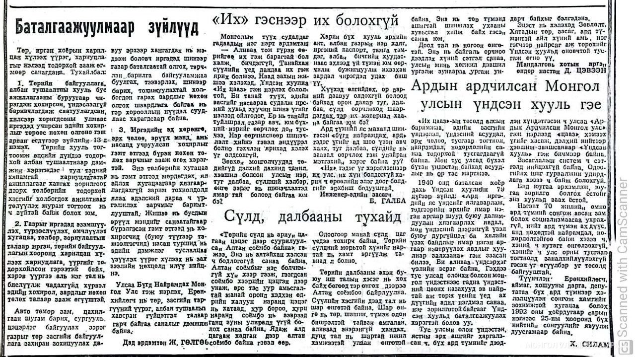 Монгол Улсын Их цааз (Үндсэн хууль)-ын төслийг 1991 оны 6 дугаар сарын 10-наас 1991 оны 9 дүгээр сарын 1-ний хооронд ард нийтээр хэлэлцүүлж дүгнэсэн бөгөөд иргэд Үндсэн хууль хүчин төгөлдөр болох хүртэлх хугацаанд өөрсдийн санал бодлоо ирүүлсээр байжээ.