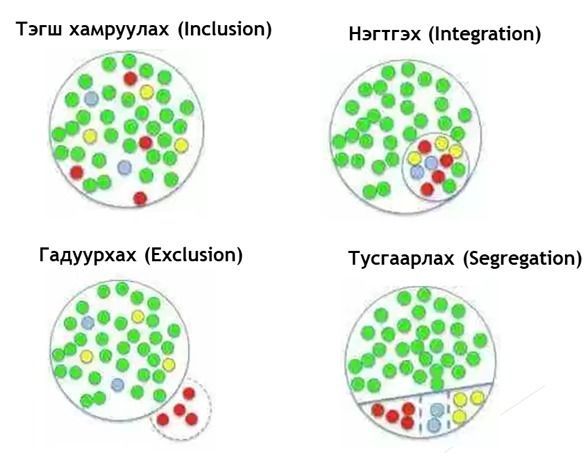 Бид өөрсдөө хүүхдүүдийг хөгжлийн бэрхшээлтэй гэж ялгаж тусгай сургуульд сургаж, дотуур байранд нь гэрээс нь хол байлгаж байгаа нь буруу. Хоёрдугаарт, энэ хүүхэд хөгжлийн бэрхшээлтэй учир үгсийн сан муу, харилцаа байхгүй, танин мэдэхүйн хоцрогдолтой гэж ялгаж болохгүй. Өөрөөр хэлбэл, хүн бүрийг тэгшитгэхээсээ илүү хөгжлийн бэрхшээлтэй ч байсан хамаагүй яг үе тэнгийнхээ хүүхдүүдтэй хамт суралцаад мэдлэг, ур чадварын хувьд үе тэнгийнхэнтэй нь адил түвшинд хүргэж байгааг тэгш байдал гэж хэлнэ.