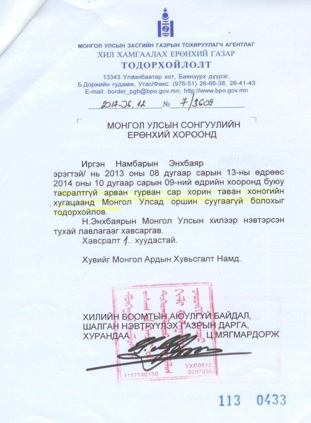 Монгол Ардын Хувьсгалт Намаас Монгол Улсын Ерөнхийлөгчийн 2017 оны сонгуульд нэрийг нь дэвшүүлсэн Н.Энхбаяр нь Сонгуулийн тухай хуулийн дээрх шаардлагыг хангаагүй буюу 2013 оны 8 дугаар сарын 13-ны өдрөөс 2014 оны 10 дугаар сарын 9-ний өдрийн хооронд буюу тасралтгүй арван гурван сар хорин таван хоногийн хугацаанд Монгол Улсад оршин суугаагүй болохыг Хил хамгаалах ерөнхий газрын 2017 оны 5 дугаар сарын 12-ны өдрийн 7/3609 дугаар тодорхойлтод дурдсан байна.