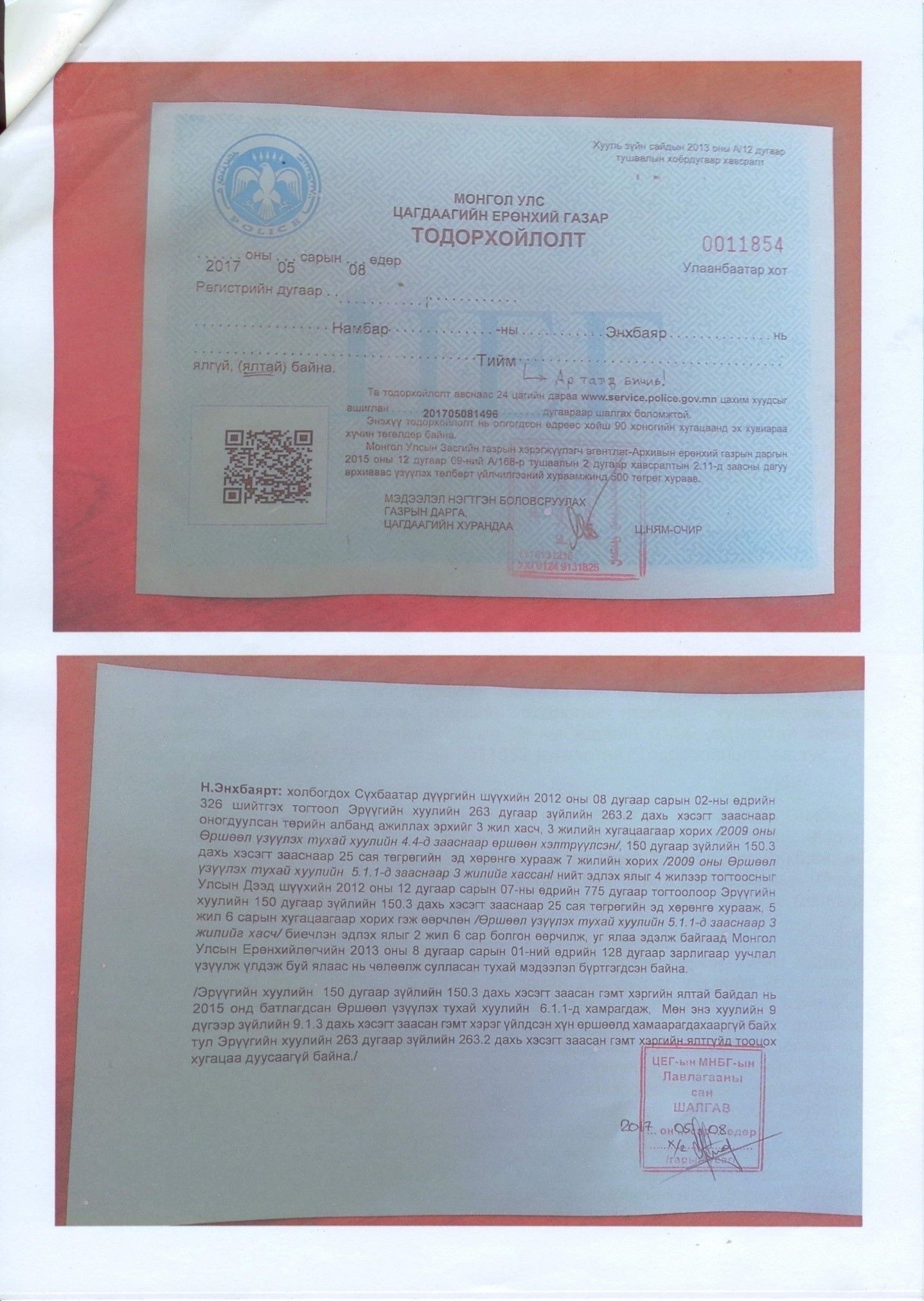 Монгол Ардын Хувьсгалт Намаас Монгол Улсын Ерөнхийлөгчийн 2017 оны сонгуульд нэрийг нь дэвшүүлсэн Н.Энхбаяр нь ялтай буюу ялгүйд тооцогдох хугацаа нь дуусаагүй болохыг Цагдаагийн Ерөнхий газрын Мэдээлэл нэгтгэн боловсруулах газрын 2017 оны 5 дугаар сарын 8-ны өдрийн №0011854 дугаар тодорхойлолтоор тодорхойлсон байна.
