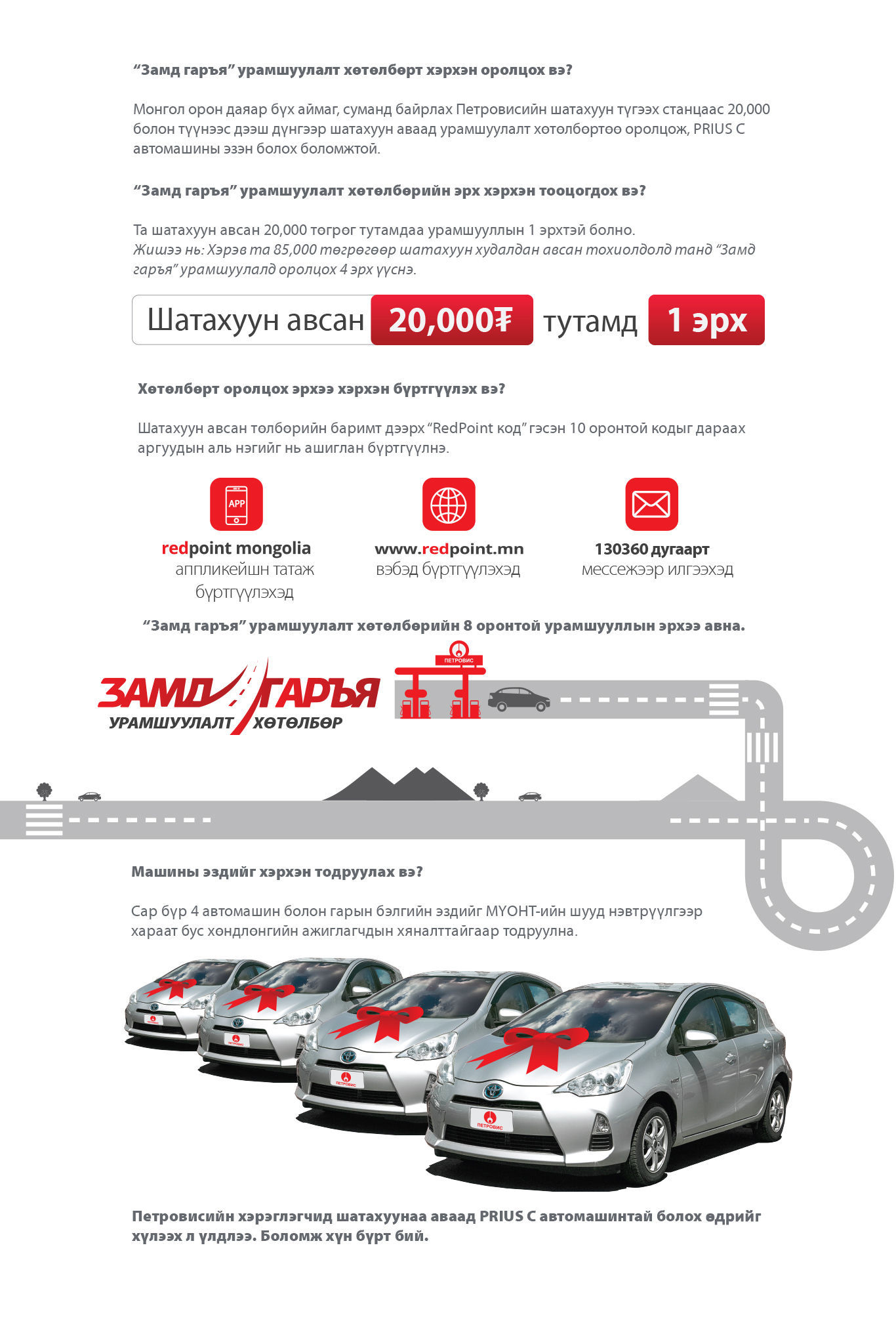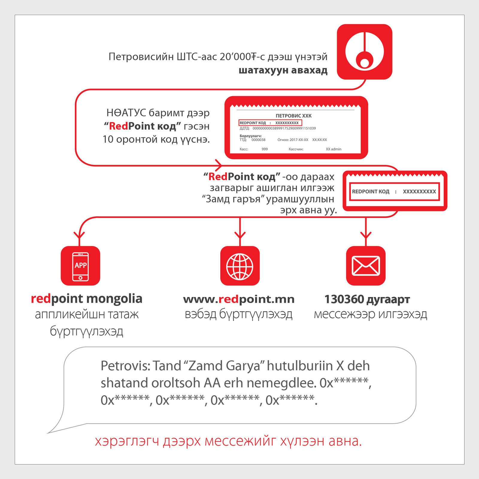 Шатахуун авсан төлбөрийн баримт дээрх “RedPoint код”-оо бүртгүүлснээр урамшуулалд оролцох эрхээ авна.