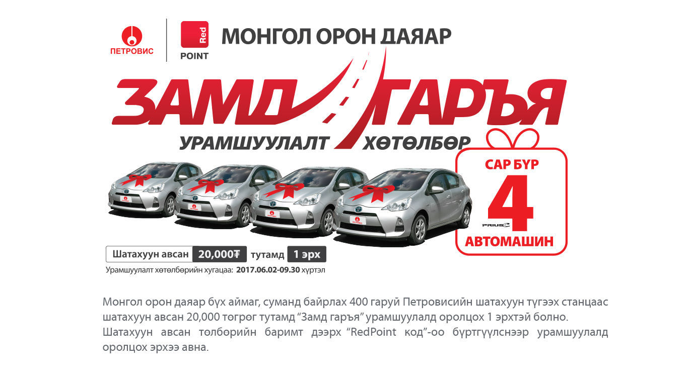 Хэрэглэгч, харилцагчдынхаа сэтгэл ханамжийг ямагт эрхэмлэн ажилладаг Петровис групп өөрийн хэрэглэгчдийн худалдан авалтын оноонд суурилсан RedPoint урамшууллын хөтөлбөрийг “Замд гаръя” хөтөлбөртэйгөө хослуулан зарлалаа.