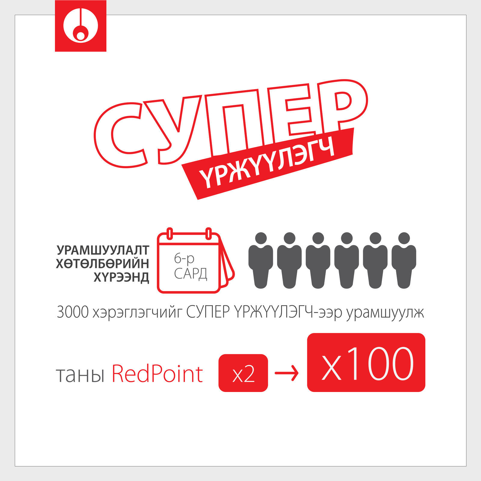 Худалдан авалтын 100 төгрөг тутамд 1 RedPoint хуримтлагддаг энэхүү хөтөлбөр оноогоо улам арвижуулах боломжийг хэрэглэгчдэдээ олгож “Супер үржүүлэгч”-ээр бэлэг барьж байна.