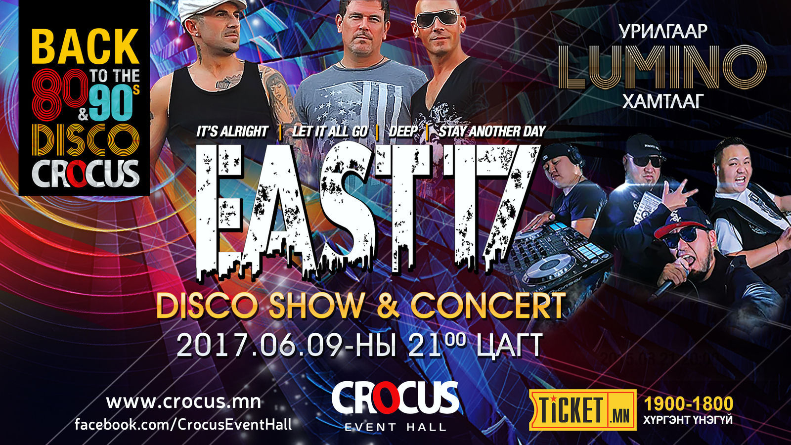 1990 ээд оны залуусын шүтээн болж дэлхий нийтийн хөгжмийн чиг хандлагыг тодорхойлж байсан алдарт Их Британийн хөвгүүдийн хамтлаг EAST17 их хотын хамгийн том энтертайнмент төв Крокус эвент холл-ын тайзнаа 06-р сарын 09-нд тоглолтоо хийхээр болсон байна.