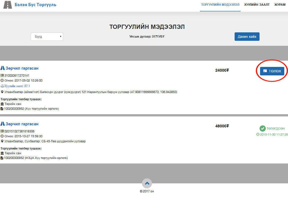Торгуулиа сонгон Төлөх товчлуур дээр дарна. Гүйлгээний мэдээлэл гарч ирэх ба утасны дугаар болон цахим хаягаа оруулан гүйлгээ хийх товчлуур дарна. Ингэснээр картын мэдээлэл оруулах хуудас гарч ирэх бөгөөд картын мэдээллийг үнэн зөв оруулснаар таны торгууль төлөгдөнө.
