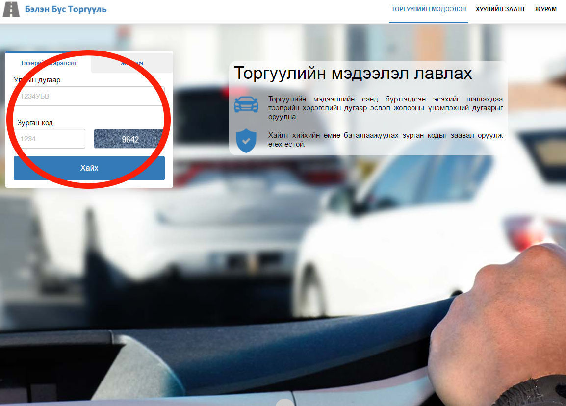 www.torguuli.police.gov.mn цахим хуудсанд нэвтрэн автомашины улсын дугаар эсвэл жолоочийн үнэмлэхийн дугаараа оруулан Хайх товчлуур дээр дарна.