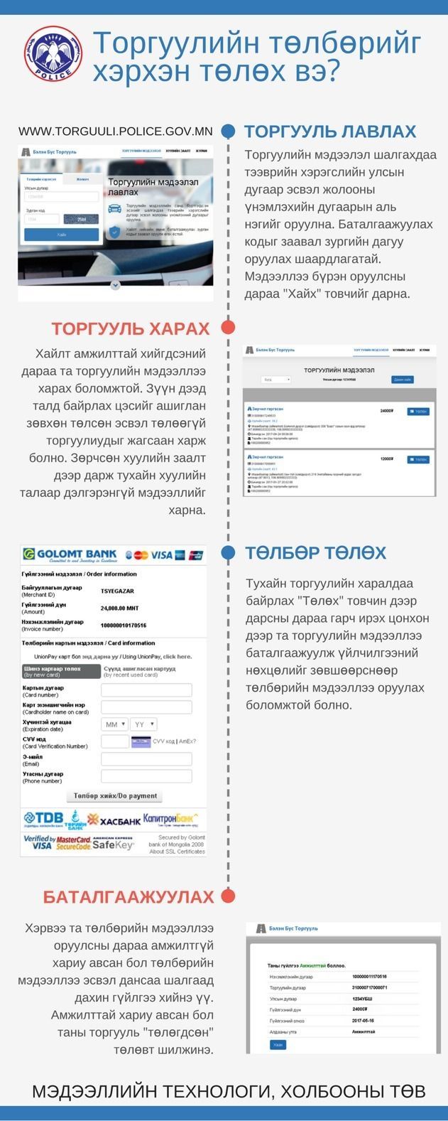 Иргэд шинээр боловсруулсан www.torguuli.police.gov.mn цахим хуудаснаас өөрийн тээврийн хэрэгслийн болон жолоочийн үнэмлэхийн дугаарыг ашиглан торгуулийн мэдээлэл лавлах, төлбөрийн карт (₮ карт, VISA, Master, Unionpay, American Express карт)-аар онлайн хэлбэрээр торгуулийн төлбөр төлөх боломжтой боллоо.