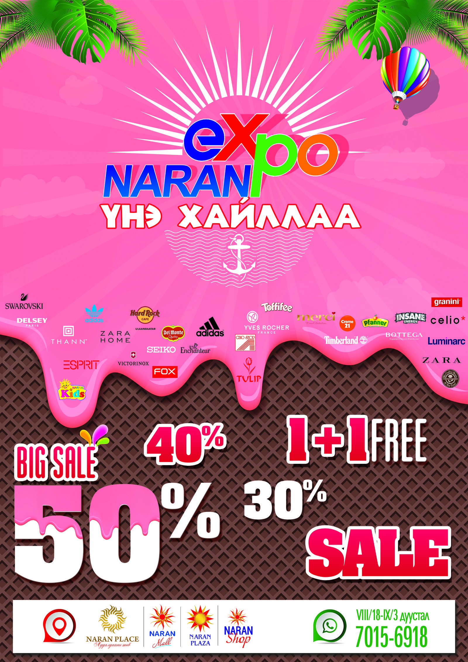 Жил бүр уламжлал болгон 8-р сард зохион байгуулагддаг Наран Экспогийн энэ жилийн онцлог нь Наран Плаза, Наран Молл, Наран Плейс, Наран Шоп гэсэн 4 том худалдааны төвд нэгэн зэрэг 2017/08/18-09/03-г дуустал зохион байгуулагдах болсон байна.