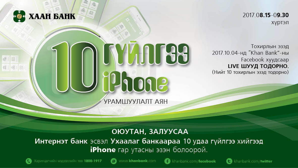 ХААН Банкнаас нийт оюутан, залуустаа зориулан “10 Гүйлгээ: 10 iPhone” урамшуулалт аяныг 2017.08.15-2017.09.30-ны өдрийг дуустал улс орон даяар эхлүүллээ.