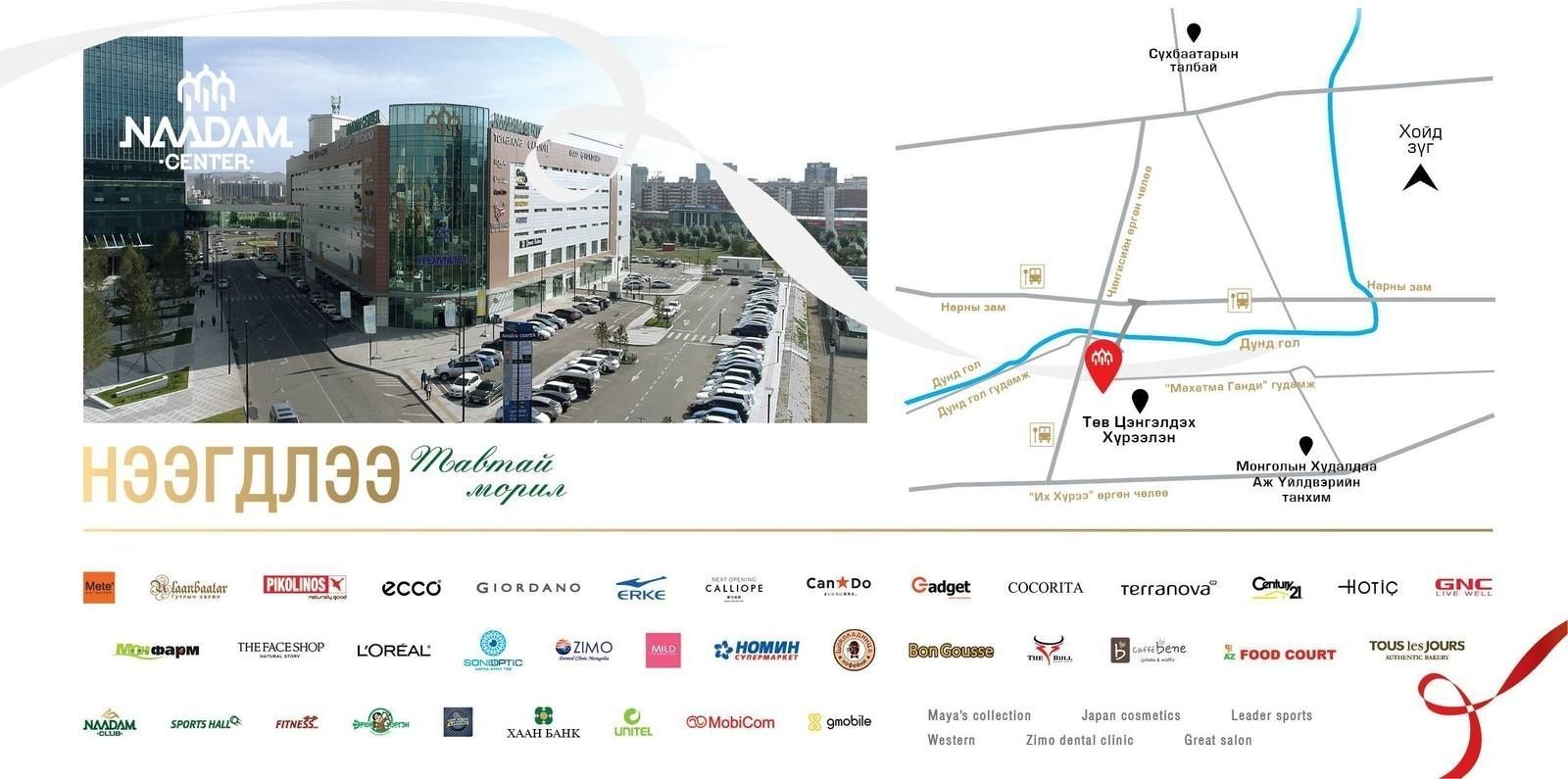 Наадам центр нь 42,000 мкв талбай бүхий зургаан давхар худалдаа, үйлчилгээ, авто зогсоол, спорт клуб гэх мэт хүний хэрэгцээт бүхий л зүйлсийг нэг доор төвлөрүүлсэн төв юм.