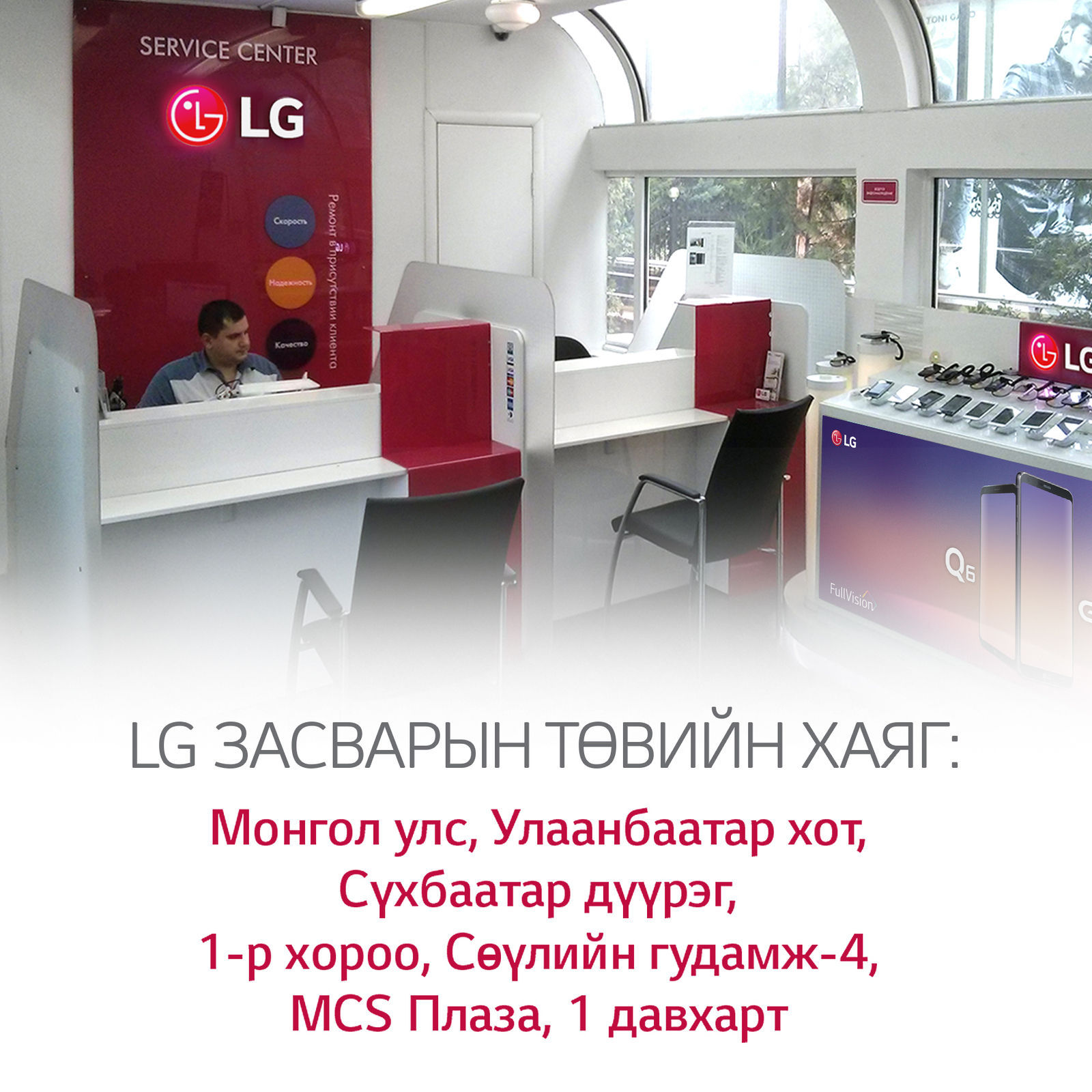 Монголд хамгийн анхны LG Electronics-ийн ухаалаг гар утасны албан ёсны засвар үйлчилгээний төв байгуулагдлаа. Энэхүү засвар үйлчилгээний төв нь Улаанбаатар хотын төвд буюу Сүхбаатар дүүрэг, 1-р хороо, Сөүлйин гудамж, Эм Си Эс Плаза-д байрлах бөгөөд ажлын өдрүүдэд өглөө 9:00-с орой 18:00 цагийн хооронд ажиллах юм.