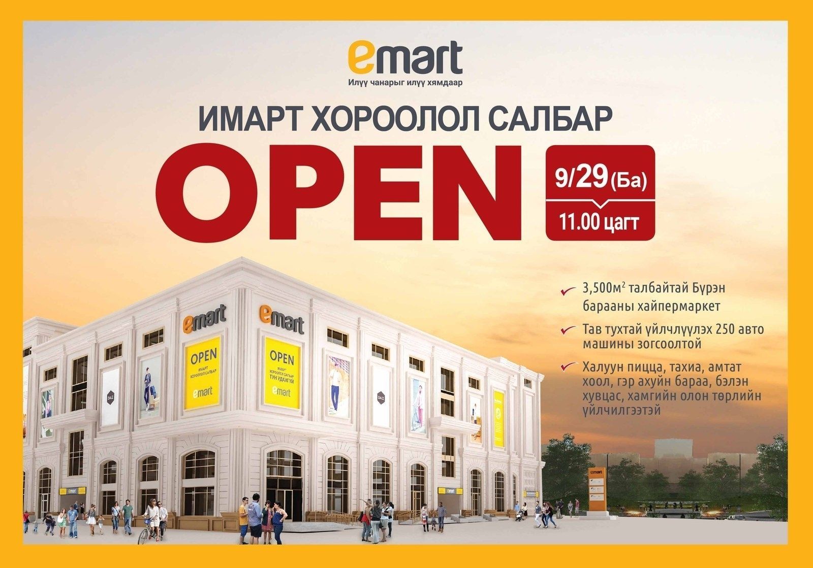 “Скай хайпермаркет” ХХК-иас Имарт /Emart/ сүлжээ дэлгүүрийн хоёр дахь салбараа Баянгол дүүргийн 3,4 дүгээр хорооллын эцэст байрлах Соло молл дэлгүүрт шинээр нээж байна.