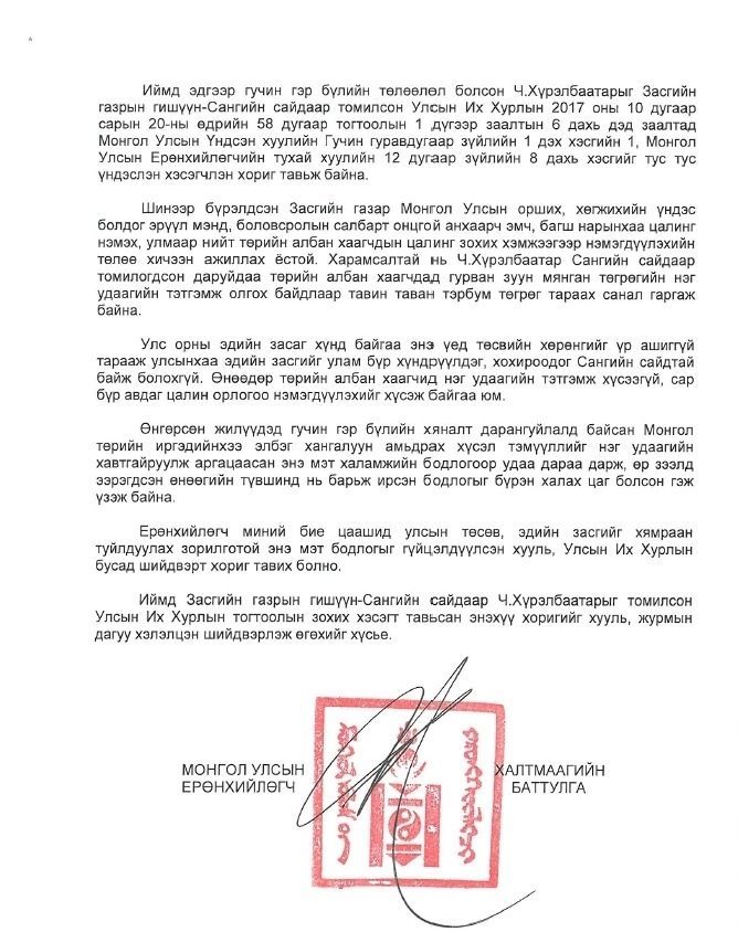 Иймд эдгээр гучин гэр бүлийн төлөөлөл болсон Ч.Хүрэлбаатарыг Засгийн газрын гишүүн-Сангийн сайдаар томилсон Улсын Их Хурлын 2017 оны 10 дугаар сарын 20-ны өдрийн 58 дугаар тогтоолын 1 дүгээр заалтын 6 дахь дэд заалтад Монгол Улсын Үндсэн хуулийн Гучин гуравдугаар зүйлийн 1 дэх хэсгийн 1, Монгол Улсын Ерөнхийлөгчийн тухай хуулийн 12 дугаар зүйлийн 8 дахь хэсгийг тус тус үндэслэн хэсэгчлэн хориг тавьж байна.