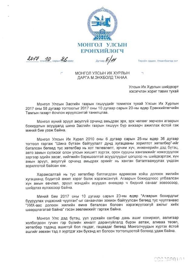Уг албан бичигт “Монгол Улсын Засгийн газрын гишүүдийг томилох тухай Улсын Их Хурлын 2017 оны 58 дугаар тогтоолыг 2017 оны 10 дугаар сарын 20-ны өдөр Ерөнхийлөгчийн Тамгын газарт ёсчлон ирүүлсэнтэй танилцлаа. Монгол хүний эрүүл аюулгүй орчинд амьдрах эрх, эрх чөлөөг зөрчсөн агаарын бохирдлын асуудалд шинэ Засгийн газрын гишүүн бүр анхаарч ажиллах ёстой гэж миний бие үзэж байна. Монгол Улсын Их Хурал 2010 оны 6 дугаар сарын 25-ны өдөр 36 дугаар тогтоол гаргаж “Шинэ бүтээн байгуулалт дунд хугацааны зорилтот хөтөлбөр”-ийг баталсан бөгөөд тус хөтөлбөр нь хот төлөвлөлт, эрчим хүч, инженерийн дэд бүтэц, авто замын сүлжээг олон улсын жишигт хүргэх, орон сууцны хангамжийг нэмэгдүүлэх зэргээр эдийн засаг, нийгмийн бэрхшээлтэй асуудлуудыг цогцоор нь шийдвэрлэж, хүн амын эрүүл, аюулгүй орчинд амьдрах эрхийг нь ханган баталгаажуулах үндсэн зорилготой байсан юм. Харамсалтай нь тус хөтөлбөр батлагдсан өдрөөсөө хойш долоон жилийн хугацаанд бодитой ажил хэрэг болж хэрэгжсэнгүй. Агаарын бохирдлоос улбаалсан хүн амын өвчлөл, эрүүл мэндийн асуудал өнөөдөр ч бидний санааг зовоосоор, шийдлээ хүлээсээр байна.
