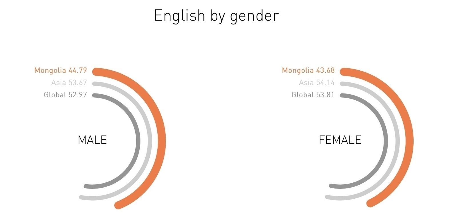 Хүйсээр нь авч үзвэл Монгол эрчүүд эмэгтэйчүүдээс бага зэрэг илүү чадвартай боловч хоёул дэлхийн болон бүс нутгийн дунджаас бага үзүүлэлттэй байна.
