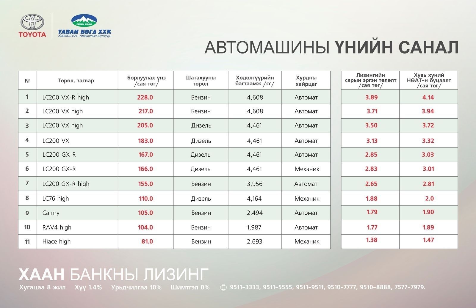 - ХасЛизинг ХХК (LC200): Урьдчилгаа 10%, хүү 1.45%, хугацаа 8 жил, зээл олголтын шимтгэл 0.5%, утас: 9907-3308 http://xacleasing.mn/