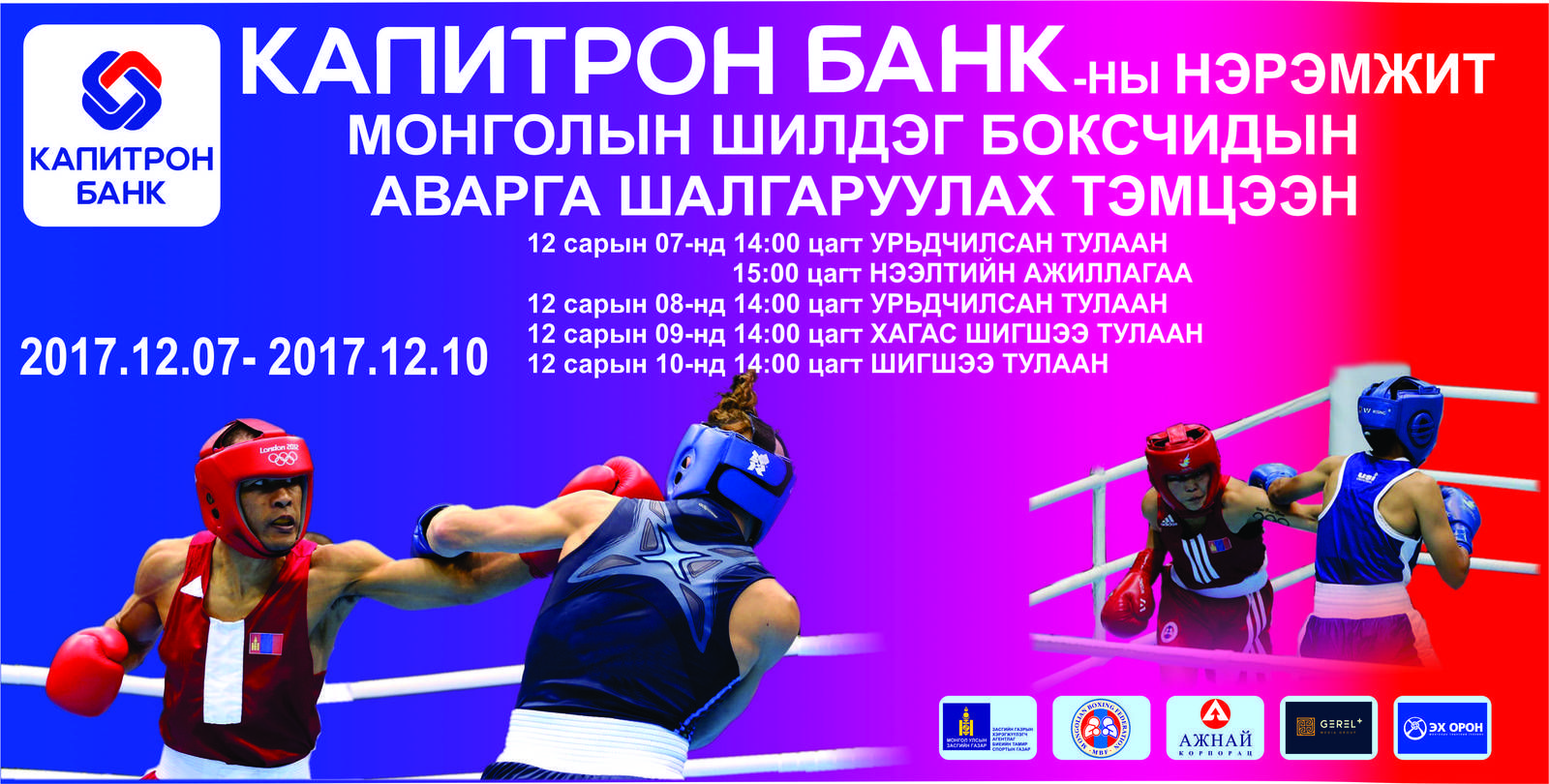 “Токио-2020” зуны олимпийн наадамд Монгол улсаа төлөөлөн өрсөлдөх ур чадвартай тамирчдыг сонгон шалгаруулах зорилготой зохион байгуулагдаж буй “Капитрон банкны нэрэмжит Монголын шилдэг боксчдын аварга шалгаруулах тэмцээн” 2017 оны 12 сарын 7-оос 10-ны өдрүүдэд Спортын төв ордонд болох гэж байна.