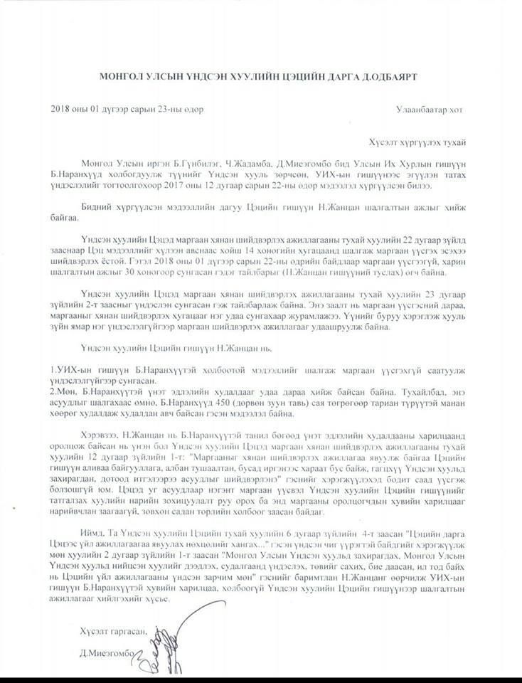 Иймд, Та Үндсэн хуулийн Цэцийн тухай хуулийн 6 дугаар зүйлийн 4-т заасан "Цэцийн дарга Цэцээс үйл ажиллагаагаа явуулах нөхцөлийг хангах..." гэсэн үндсэн чиг үүрэгтэй байдгийг хэрэгжүүлж мөн хуулийн 2 дугаар зүйлийн 1-т заасан "Монгол Улсын Үндсэн хуульд захирагдах, Монгол Улсын Үндсэн хуульд нийцсэн хуулийг дээдлэх, судалгаанд үндэслэх, төвийг сахих, бие даасан, ил тод байх нь Цэцийн үйл ажиллагааны үндсэн зарчим мөн" гэснийг баримтлан Н.Жанцанг өөрчилж УИХ-ын гишүүн Б.Наранхүүтэй хувийн харилцаа, холбоогүй Үндсэн хуулийн Цэцийн гишүүнээр шалгалтын ажиллагааг хийлгэхийг хүсье.