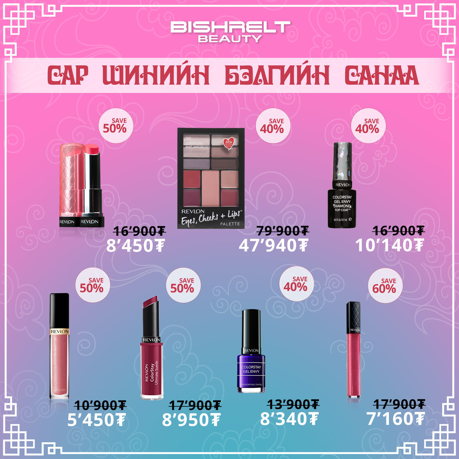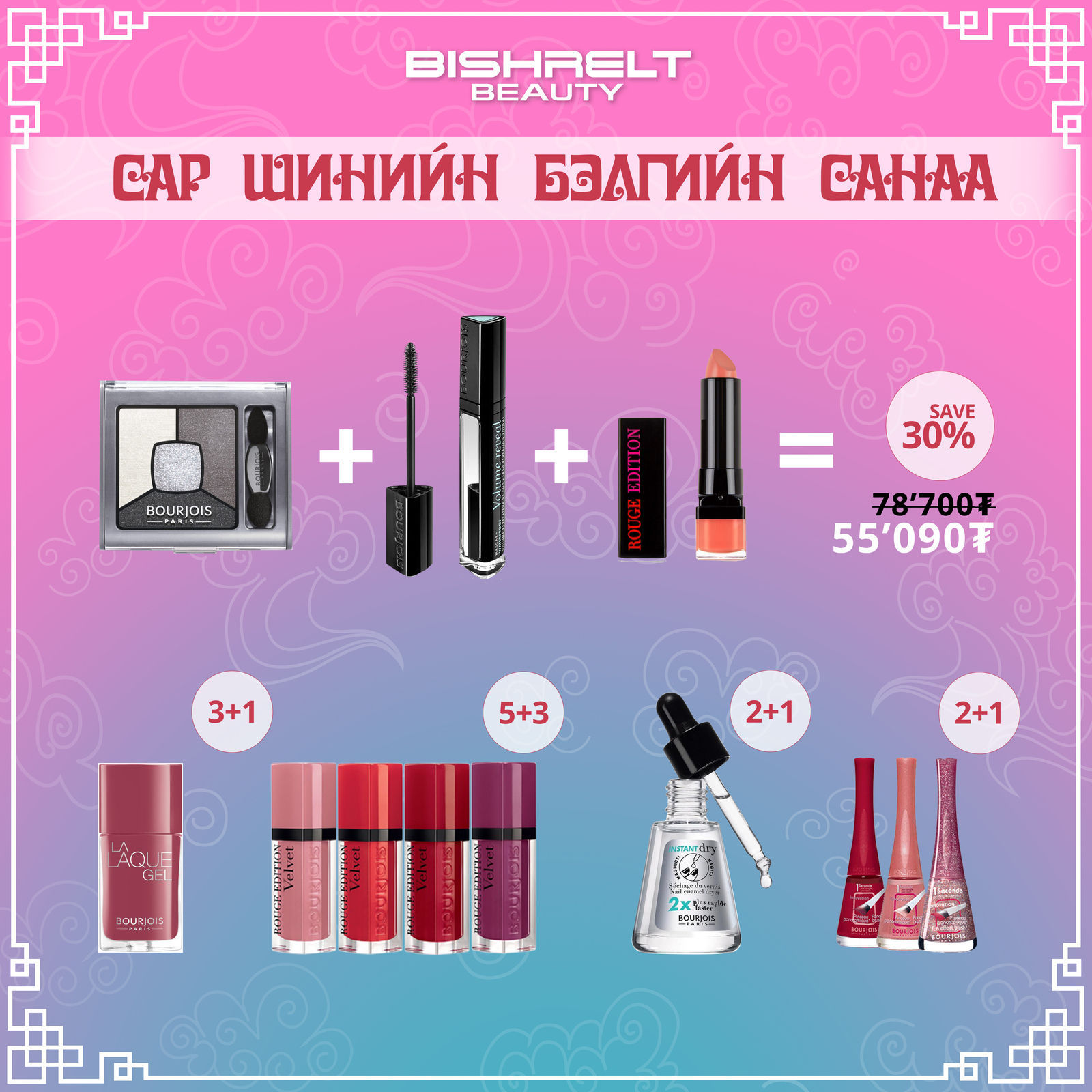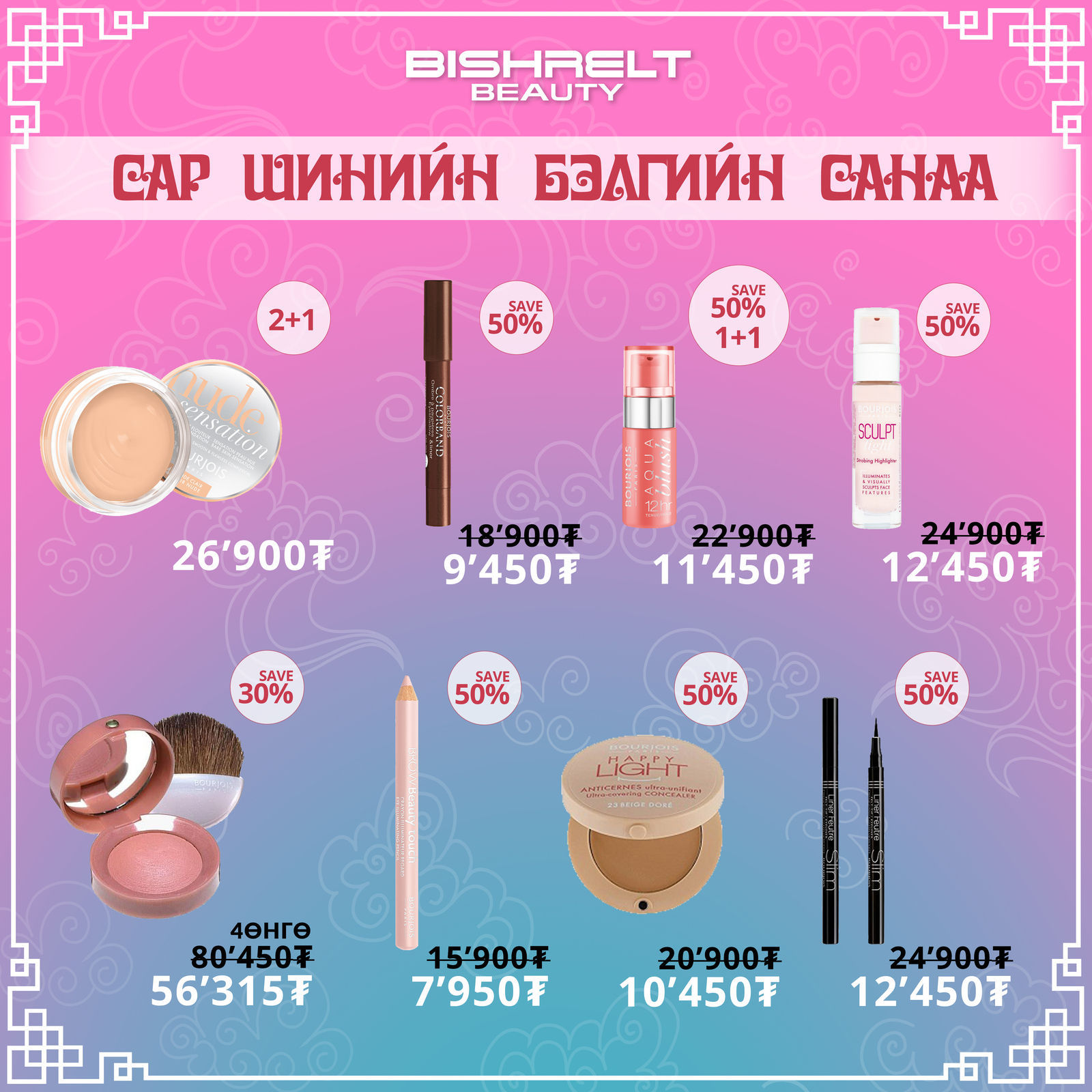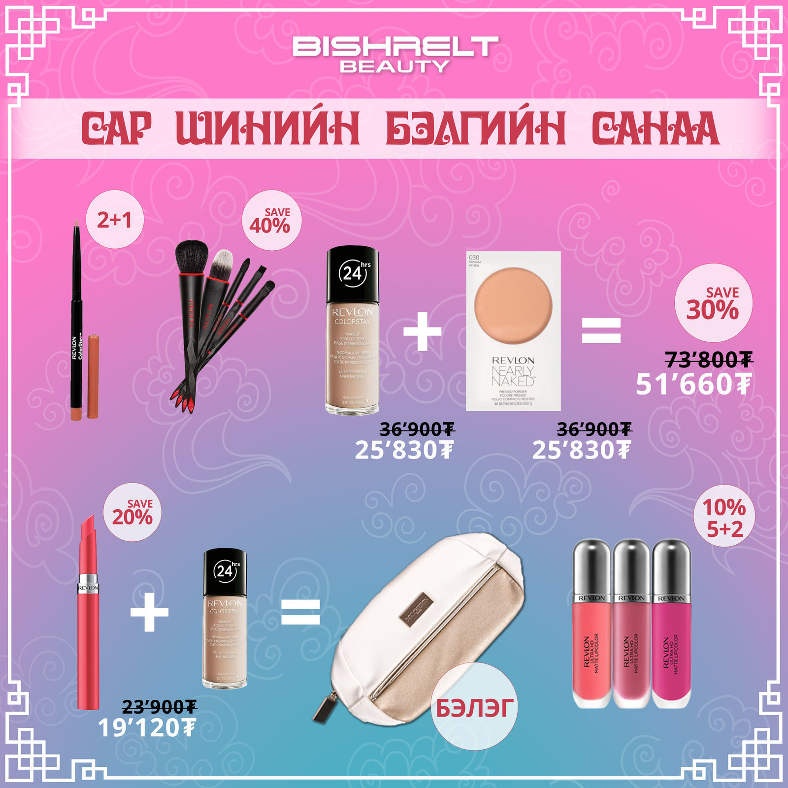 БИШРЭЛТ БЬЮТИ дэлхийд алдартай 30 гаруй брэндийн 300 орчим нэр төрлийн үнэртнүүд, нүүр будалтын Revlon, Bourjois, арьс арчилгааны IColoniali зэрэг брэндийн бүтээгдэхүүнүүддээ 10%-60%-ийн хямдрал зарлалаа. Мөн Adidas, Playboy брэндүүдийн үнэртнүүд, Revlon брэндийн үсний будагнуудаас 3+1, 5+2, 10+4 үнэгүй бэлгэнд аваарай.