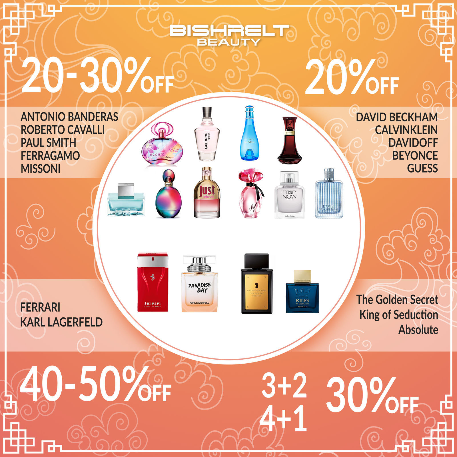 Ferragamo, Ferrari, Antonio Banderas, Calvin Klein, David Beckham, Karl Lagerfeld, Paul Smith, Guess, DavidOff, Roberto Cavalli, Beyonce, Missoni зэрэг брэндийн бүх үнэртнүүд 50% хүртэл хямдарч сонгогдсон үнэртнүүддээ 3+2 эсвэл 4+1 үнэртэн ҮНЭГҮЙ бэлэглэж байна!