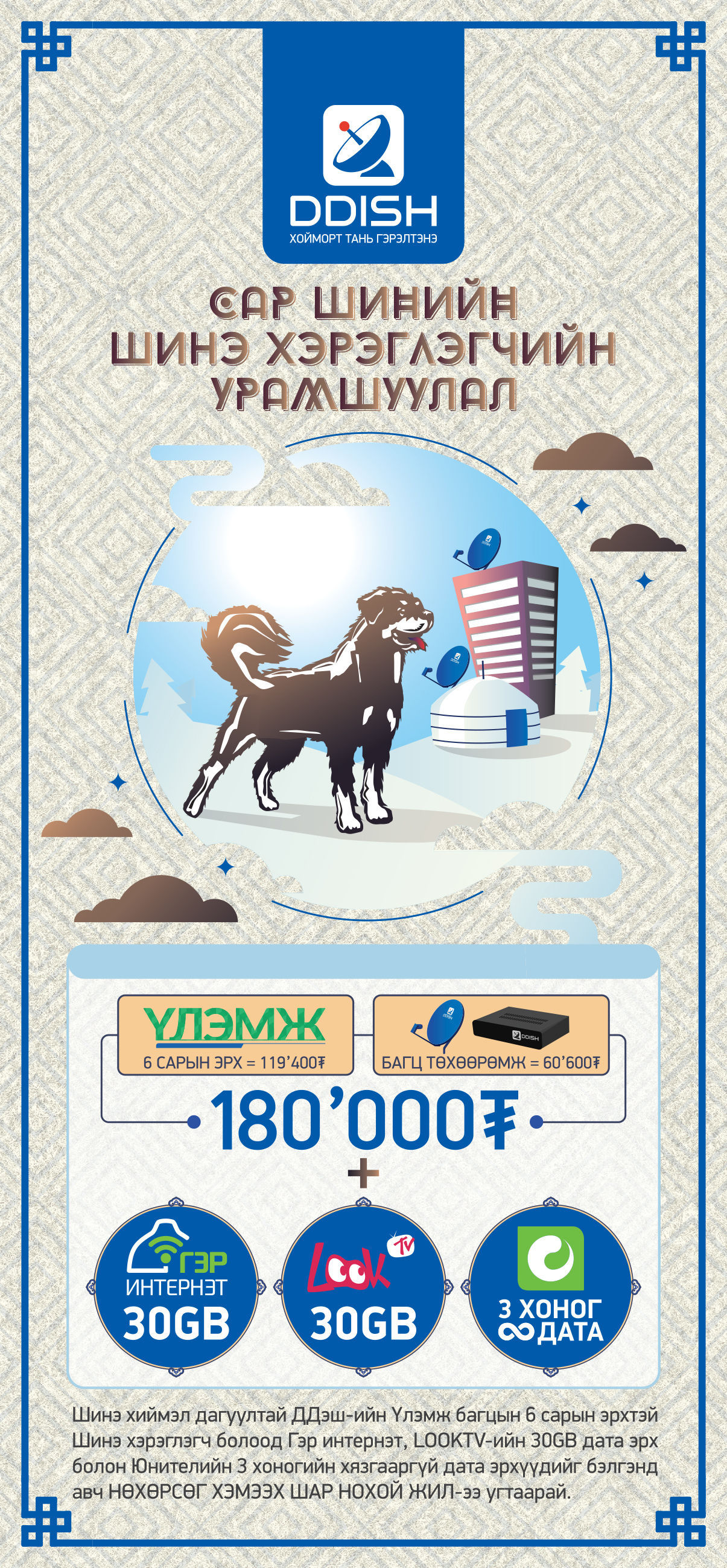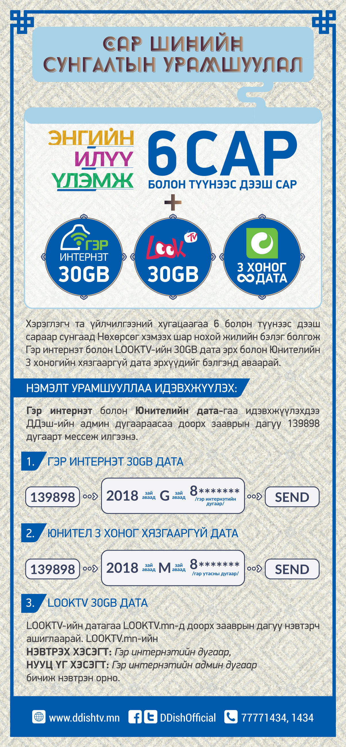 ДДэш-ийн Үлэмж багцын 6 сарын эрхтэй Шинэ хэрэглэгч болоод эсвэл одоогийн хэрэглэгчид үйлчилгээний хугацаагаа 6 болон түүнээс дээш сараар сунгаад Гэр интернэт, LOOKTV-ийн 30GB дата эрх болон Юнителийн 3 хоногийн хязгааргүй дата эрхүүдийг бэлгэнд аваарай.
