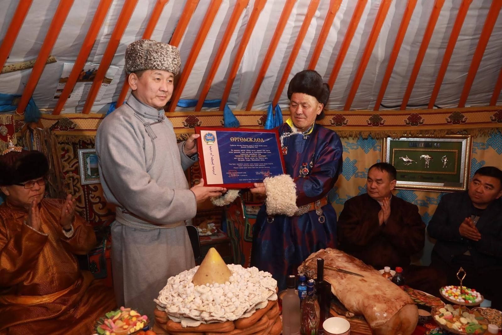 Халзан сумын хоёрдугаар багийн малчин Г.Мөнхбаяр нь 2014 онд аймгийн сайн малчин болсон бол энэ жил Улсын Аварга малчин болж байна. Малч ухаан, хөдөлмөрийг нь төрөөс үнэлж өндөр цол хэргэм олгоод зогсохгүй, Засгийн газрын тэргүүн биечлэн гардуулж өгч буйд тэрээр баяртай байна гэлээ.