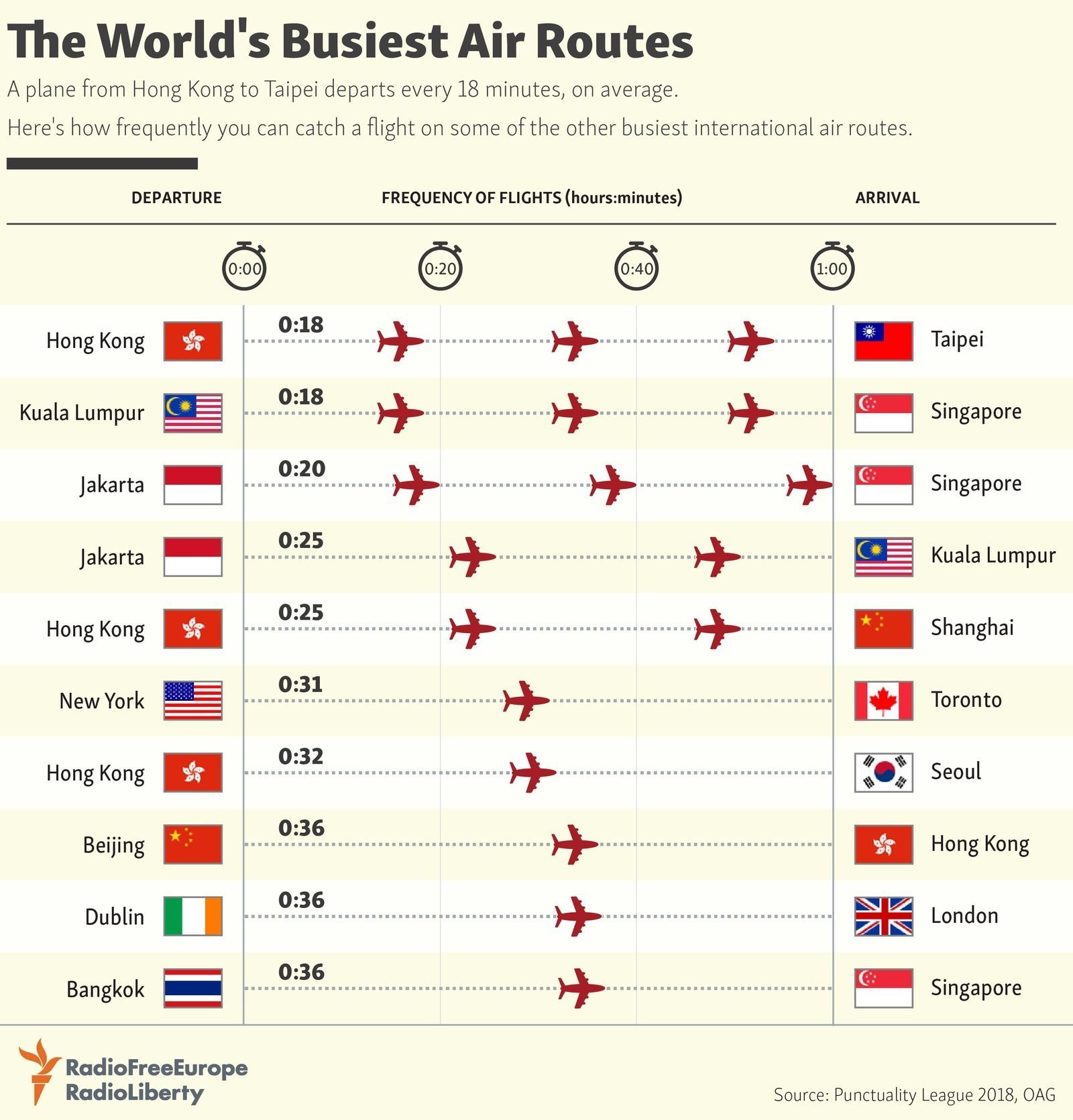 Хамгийн өндөр ачаалалтай зам нь Хонг Конг-Тайпэй чиглэлийн агаарын зам юм. Хонг Конгоос Тайваний нийслэл хүртэл 18 минут тутамд нэг онгоц нисдэг ажээ. Малайзийн нийслэл Куала Лумпураас Сингапур хот улсын чиглэлд мөн ийм давтамжтай онгоц нисдэг байна.