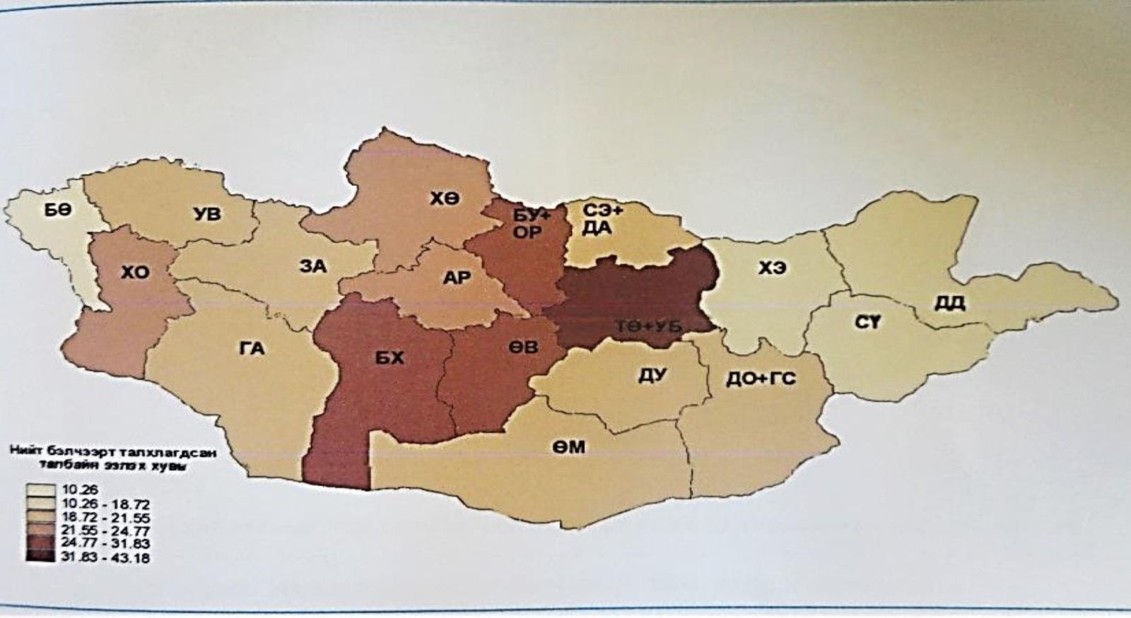 Талхлагдсан бэлчээрийн талбайг сум бүрээр нийт нутагтай нь харьцуулж үзэхэд: Төв аймагт нийт бэлчээр нутгийн 31.8-43.2%, Булган, Орхон, Өвөрхангай, Баянхонгор аймагт 24.8-31.5%, Хөвсгөл, Архангай, Ховд аймагт 21.6-24.8% нь талхлагдаад байна. Тухайн аймгийн нийт нутгийн ¼ нь муудчихаад байхад “хэвийн” гэж болох уу? Онцолж дурьдвал, нийслэл Улаанбаатар хот орчмын бэлчээрт ашиглах боломжтой гэж тогтоогдсон газрын 60 гаруй хувь нь талхлагдалд оржээ.