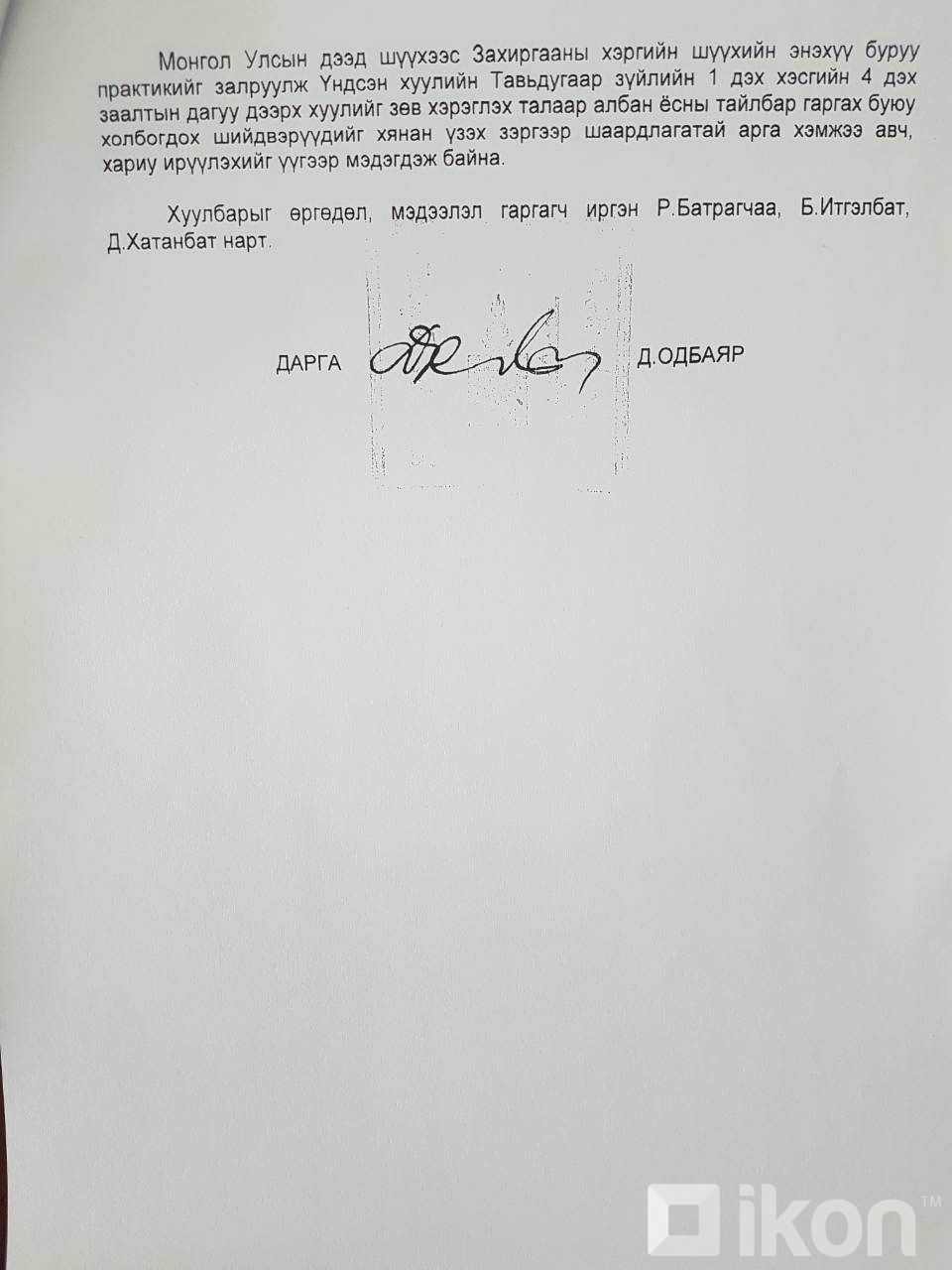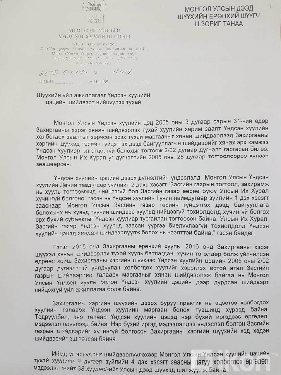Засгийн газрын шийдвэрийг хууль зөрчсөн эсэхийг захиргааны шүүх шийдэх эрхгүй гэж Үндсэн хуулийн цэцээс дахин нотолжээ. Энэ талаар Үндсэн хуулийн цэцийн дарга Д.Одбаяр Улсын дээд шүүхийн Ерөнхий шүүгч Ц.Зоригт хандсан албан бичигтээ сануулжээ.