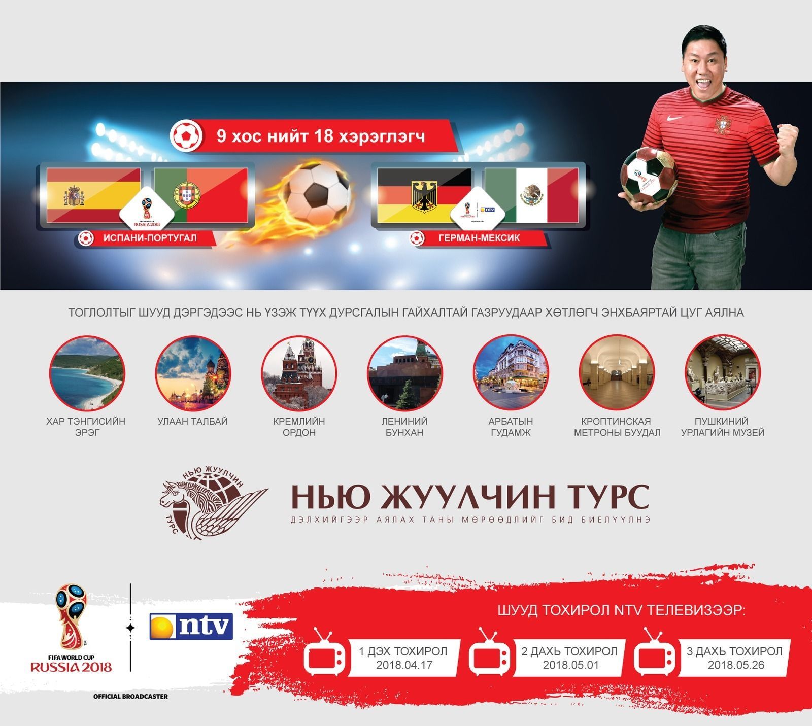 Хөлбөмбөгийн үнэнч фанатууд аа! Дэлхийн аваргын тоглолтыг Хөлбөмбөгийн спортын ТӨГС тайлбарлагч ЭНХБАЯРТАЙ хамт үзэхээс гадна үзэсгэлэнт Сочи, түүхт Москва хотуудаар аялах эрхийг 99% хямдруулж авахыг хүсэж байна уу?