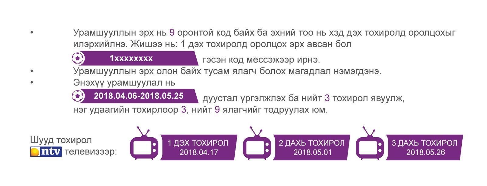 Дэлгэрэнгүй мэдээллийг Мобикомын хэрэглэгч 2222, бусад операторын хэрэглэгчид 1800-2222 дугаараас лавлана уу.