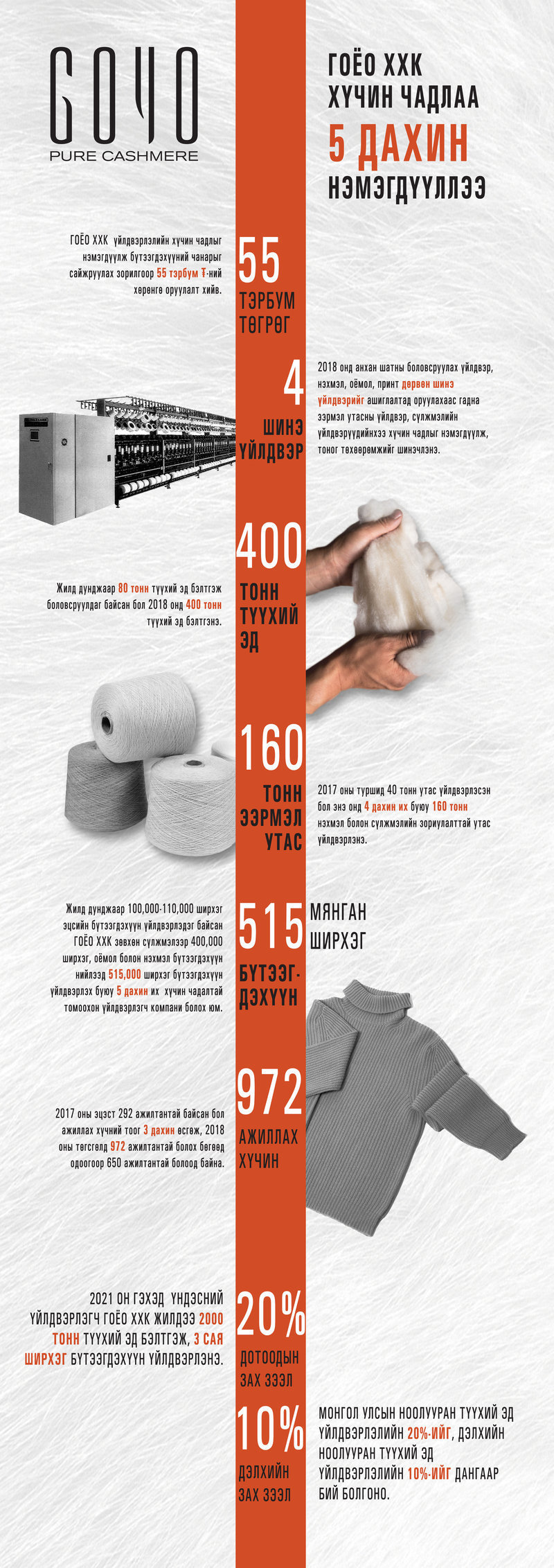 ГОЁО ХХК 2018 онд ноолуурын боловсруулалтын түвшинг ахиулах, үйлдвэрлэх бүтээгдэхүүний төрлийг нэмэгдүүлж, ээрмэл утас эцсийн бүтээгдэхүүний чанарыг сайжруулж, экспортыг өсгөхөд зориулан нийт 55 тэрбум төгрөг буюу 22.5 сая ам. долларын хөрөнгө оруулалт хийхээр төлөвлөн одоогоор 75%-ийг нь хийгээд байна.