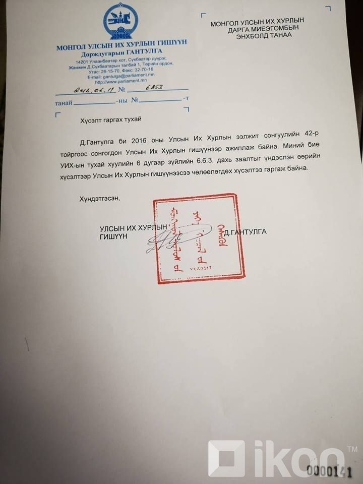 Ийм учраас УИХ-ын гишүүнээс түдгэлзэх биш чөлөөлөгдөх хүсэлтээ гаргаж байгаагаа мэдэгдэж байна. Хүсэлтээ одоо УИХ-ын даргаж албан ёсоор өгөх гэж байна" гэлээ.
