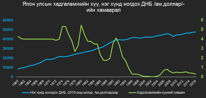 Энэ нь бусад улсад ч адил байна. Сингапурчууд 1980-аад онд хадгаламжиндаа 10 хувийн хүү санал болгодог байжээ. Тухайн үед нэг хүнд ногдох ДНБ нь 14 мянган ам.доллар байв. Харин 2016 оны эцсээр тус үзүүлэлт 52.6 мянган ам.доллар болж өсөхөд хадгаламж нь хүүгүй шахам болсон байна.