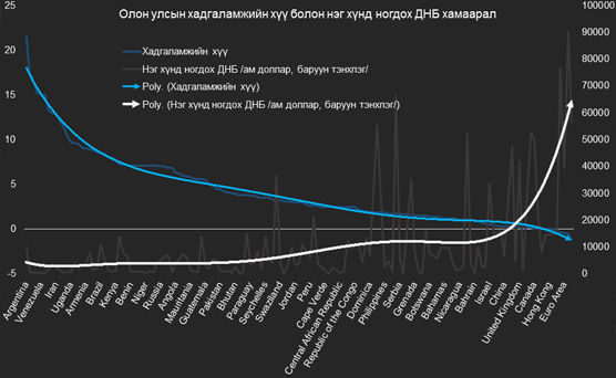Тэгвэл доорх графикт зарим улсын хадгаламжийн хүү болон нэг хүнд ногдох ДНБ-ний хамаарлыг харуулжээ. Нэг хүнд ногдох ДНБ болон хадгаламжийн хүүний шугам эсрэг хамааралтайгаар далийсан байгаа юм. Өөрөөр хэлбэл эдийн засаг сэргэхээр хадгаламжийн хүү буурах нь эдийн засгийн жамт үзэгдэл юм.