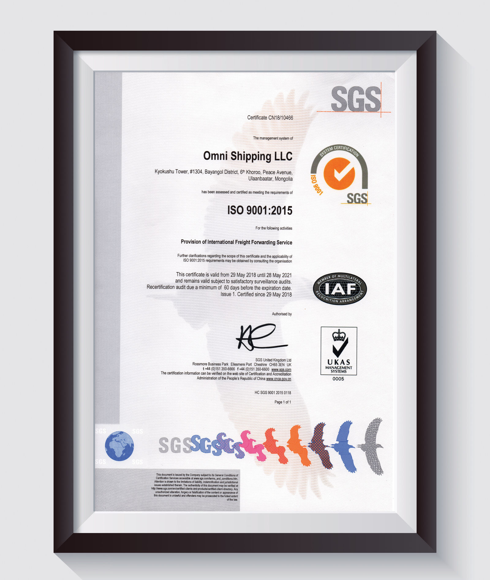 Омни Шиппинг ХХК нь Олон улсын тээвэр зуучийн үйл ажиллагаандаа Чанарын Удирдлагын Тогтолцооны ISO9001:2015 стандартыг амжилттай нэвтрүүлж олон улсад итгэмжлэгдсэн, баталгаажуулалтын SGS байгууллагаас сертификатаа (CN18/10466) энэ сарын 20-ны өдөр гардан авлаа.