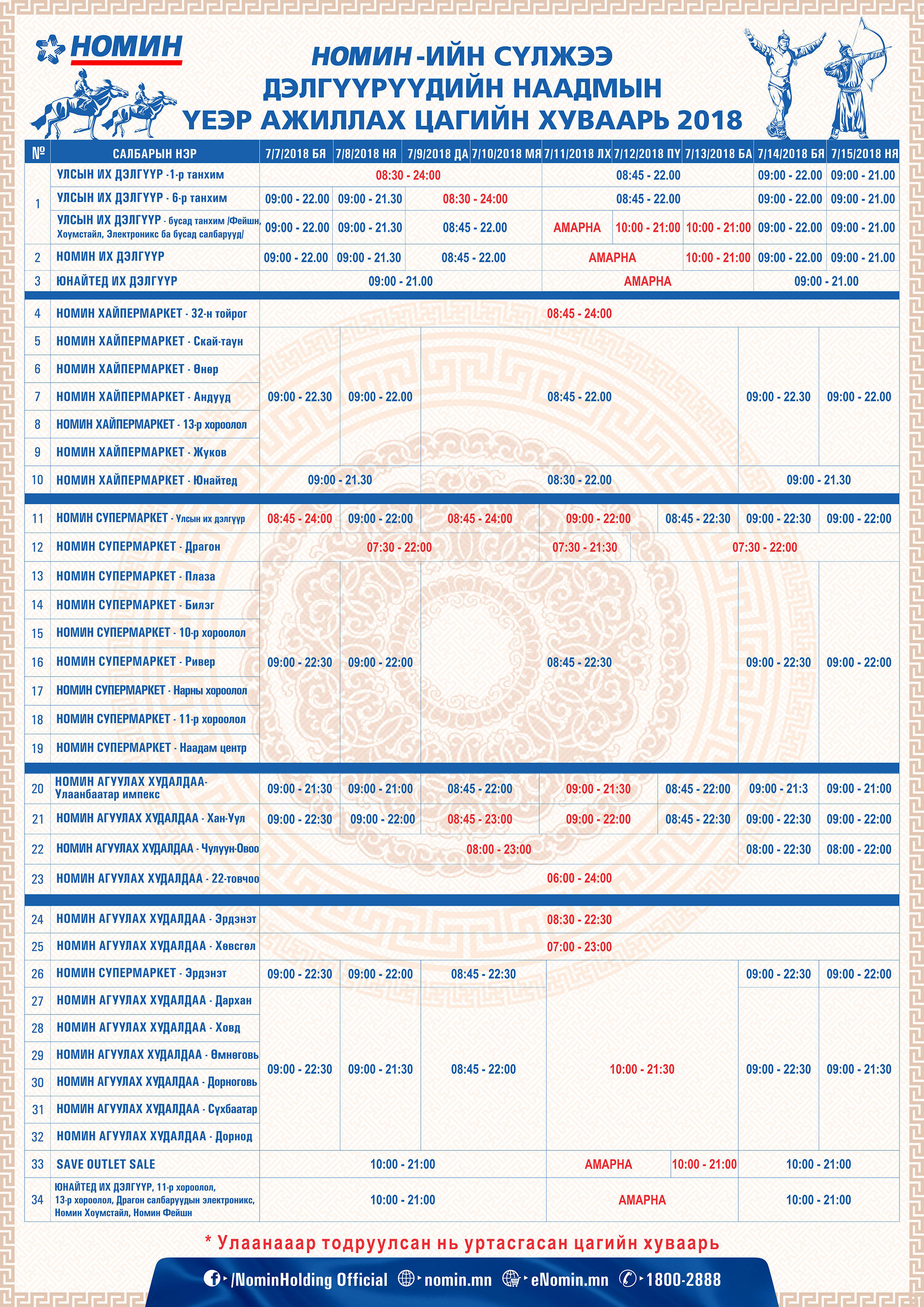 НОМИН-ийн сүлжээ дэлгүүрүүдийн 2018 оны 07 дугаар сарын 07-18 өдрийг хүртэл ажиллах цагийн хуваарийг хүргэж байна. Мөн Ардын хувьсгалын 97 жилийн ойн баярыг тохиолдуулан НОМИН-ийн салбаруудаас хийсэн 50,000₮-ийн худалдан авалт тутамд таны талон дээр урамшууллын 1 эрх олгогдож, “Өдөр бүр 3 IPHONE8” хөтөлбөрт хамрагдах боломжтой. Хөтөлбөрийн туршид нийтдээ 97 ширхэг IPHONE8 гар утас Та бүхний гарт очихыг дуулгахад таатай байна.