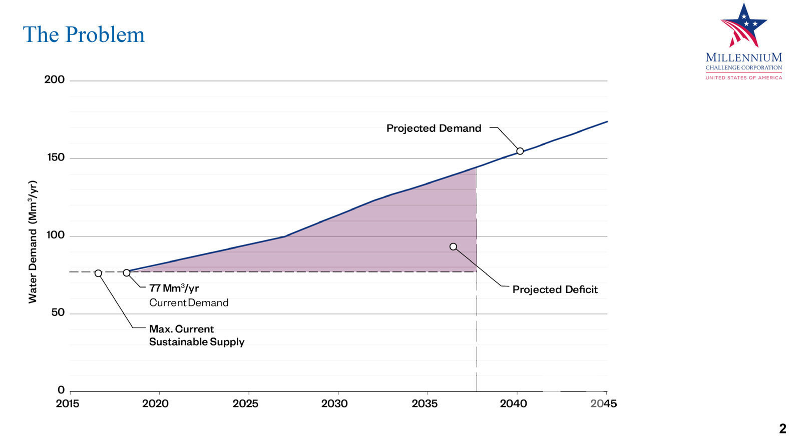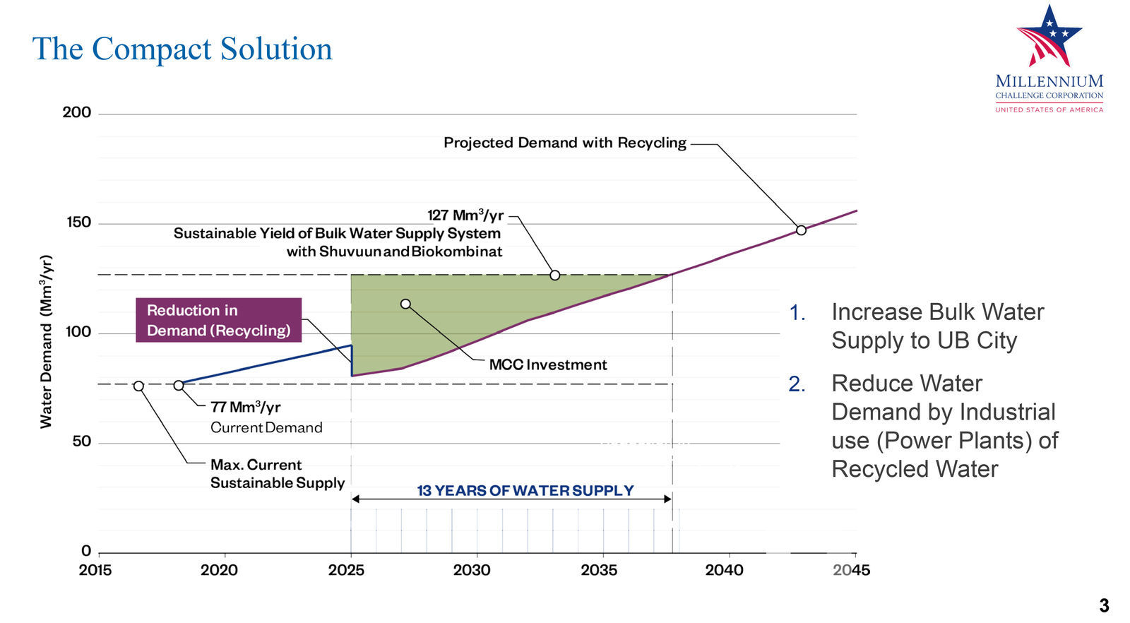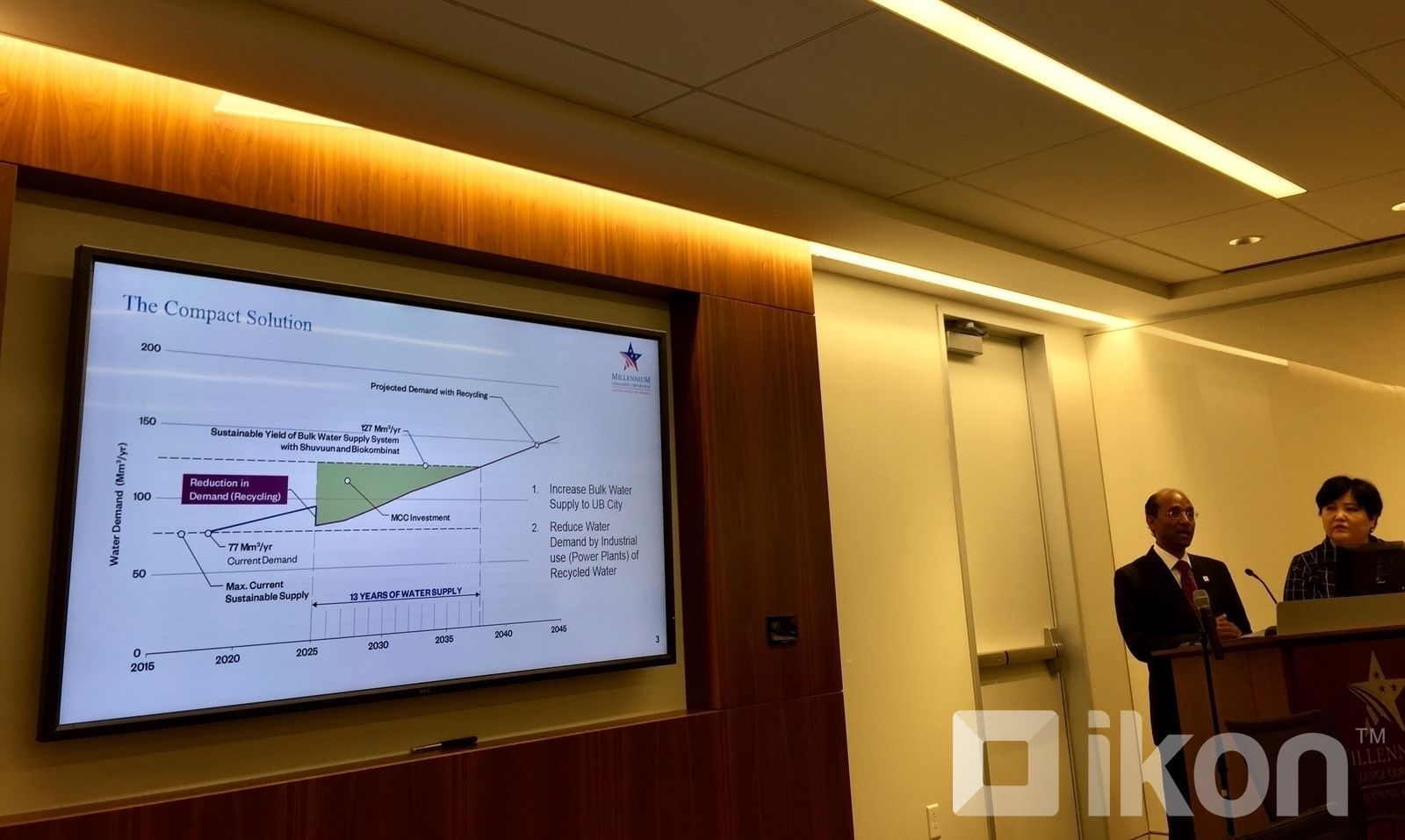 “Өнөөдрийн байдлаар Улаанбаатарчуудын нэг жилийн усны хэрэгцээ 77 сая м3 бол өсөн нэмэгдэж буй хүн ам, үйлдвэр, аж ахуйн хэрэгцээг одоогийн нөөцөөр хангах боломжгүй. Хэрэв Улаанбаатарчууд нөөцөө нэмэгдүүлэхгүй бол удахгүй хэрэглээний хязгаарлалтад орох байсан. Мөн Туул голын тамирыг барах байв” гэж Мянганы Сорилтын Корпорацийн Усны асуудал хариуцсан захирал Кумар Ранганатан танилцууллаа.