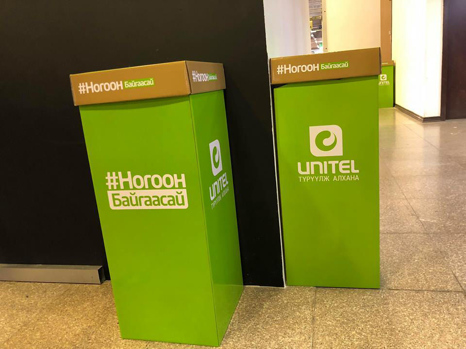 Мишээл экспогийн үзэсгэлэнгийн танхимын үүднээс эхлээд л хаа сайгүй "Ногоон байгаасай" хаягтай хогийн савыг байршуулсан байна. Юнител группээс нийгмийн хариуцлагынхаа хүрээнд нэг удаагийн хогийн савыг олон нийтийн арга хэмжээний үеэр олон тоогоор байршуулдаг уламжлалтай болоод буй. Улсын наадмын үеэр Төв цэнгэлдэх хүрээлэнд гурван өдрийн турш 100 ширхэг хогийн сав байршуулж байсан бол ICT-Expo-н үеэр мөн 50 нэг удаагийн хогийн савыг байршуулсан байна.