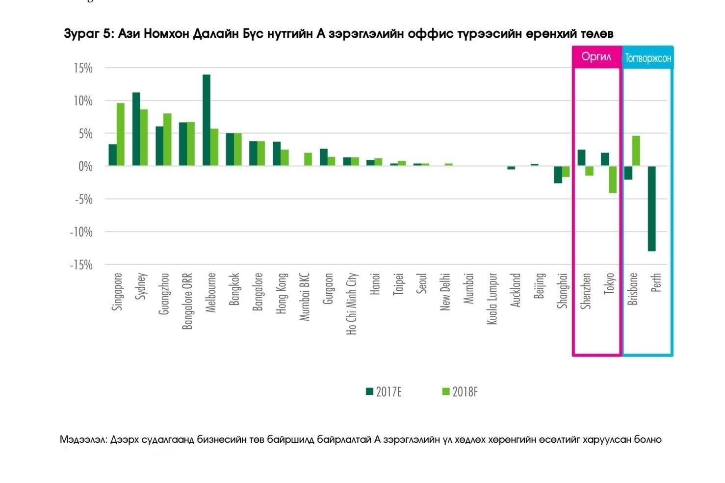 2018 онд Ази, Номхон Далайн бүс нутгийн хэмжээнд А зэрэглэлийн бизнесийн төв байршил дахь түрээсийн өсөлт хязгаарлагдмал хэвээр байх ба АНУ-ын Худалдааны Үл Хөдлөх Хөрөнгийн Судалгааны байгууллагаас 15 томоохон зах зээлд хийсэн судалгаагаар жилийн өсөлт 2%-тай байх төлөвтэй байна.