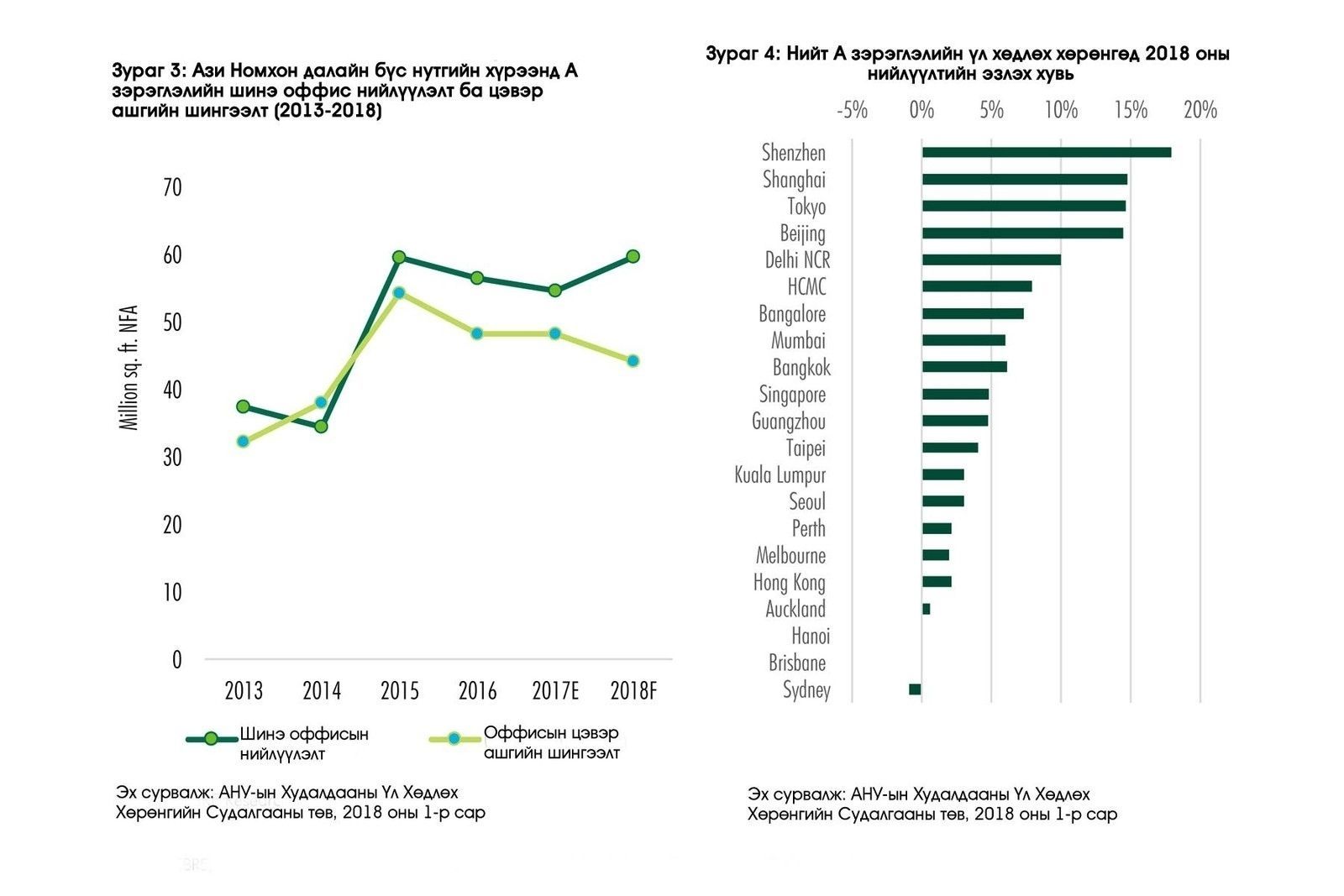 Монгол улсад ч мөн А зэрэглэл дэх түрээсийн эрэлт үргэлжлэн нэмэгдсээр байгаа боловч уул уурхайн салбар эрчимтэй хөгжиж байсан тэрхүү 5 жилийн өмнөхтэй харьцуулахад өсөлтийн хурд бага байгаа юм.