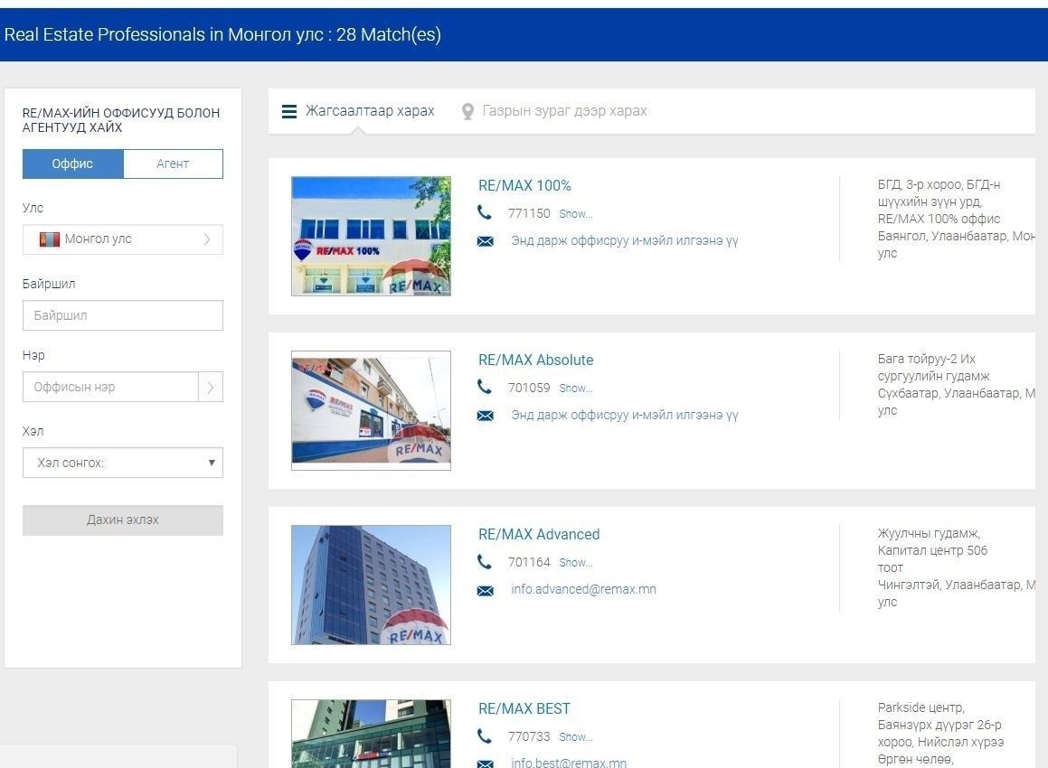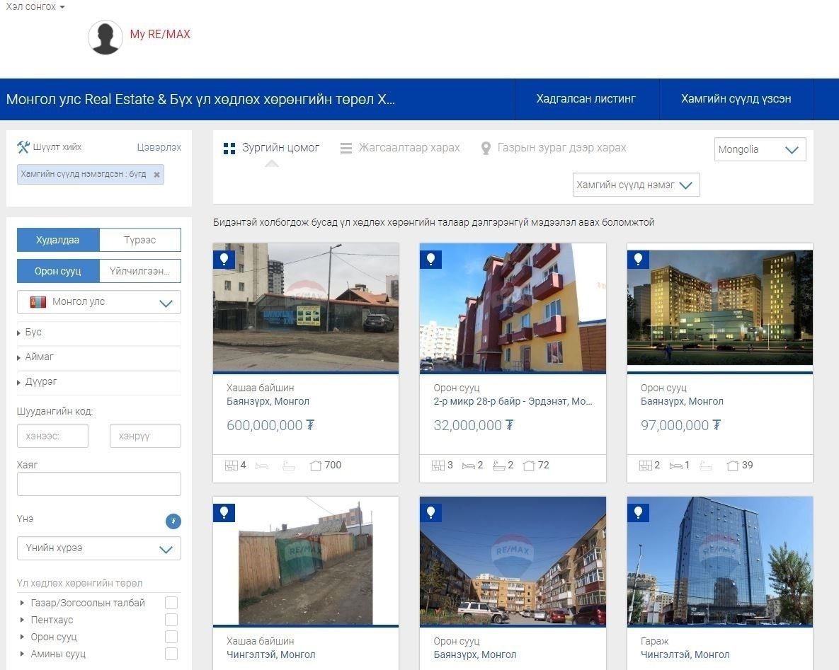 Үл хөдлөх хөрөнгийн зуучлалын салбарт маш өргөн хүрээгээр үйл ажиллагаагаа явуулдаг RE/MAX компанийхан маань remax.mn вэб сайтаа шинэчилж хэрэглэгчдийнхээ хүсэлд нийцэх түрээс, худалдаа, оффис, агентаар нь хайлт хийх боломжтой хамгийн ойлгомжтой байдлаар хайлтын системээ шинэчилжээ.
