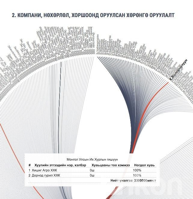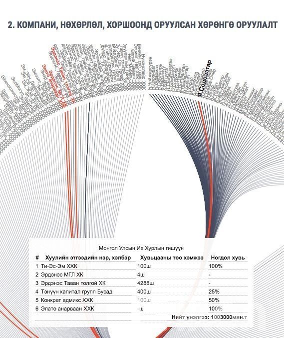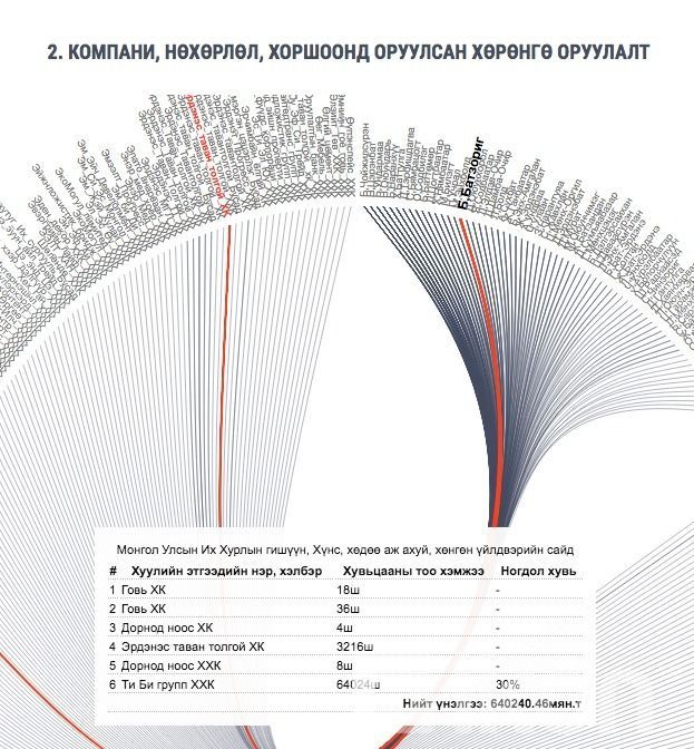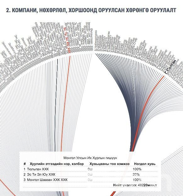 Тэгвэл УИХ-ын гишүүдийн хөрөнгө орлогын мэдүүлгээс үзвэл УИХ-ын гишүүн Х.Болорчулуун нь "Дорнод гурил" компанийн 100%-ийн, УИХ-ын гишүүн Г.Солтан "Монгол шаазан" компанийн 100%-ийн, УИХ, Засгийн газрын гишүүн Я.Содбаатар "Эпато анарваан" компанийн 100%-ийн эзэмшигч болохоо бичсэн байна.