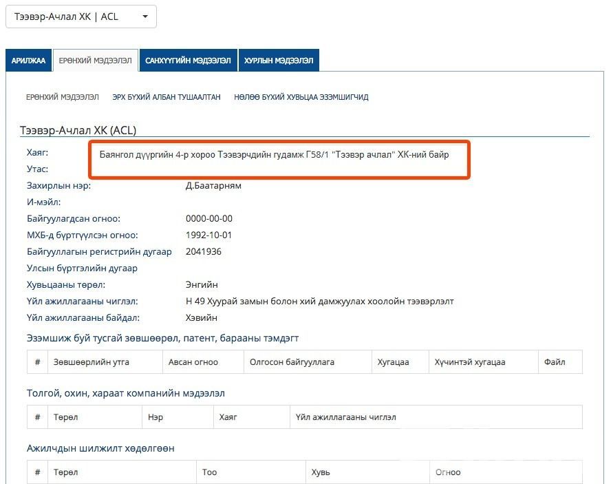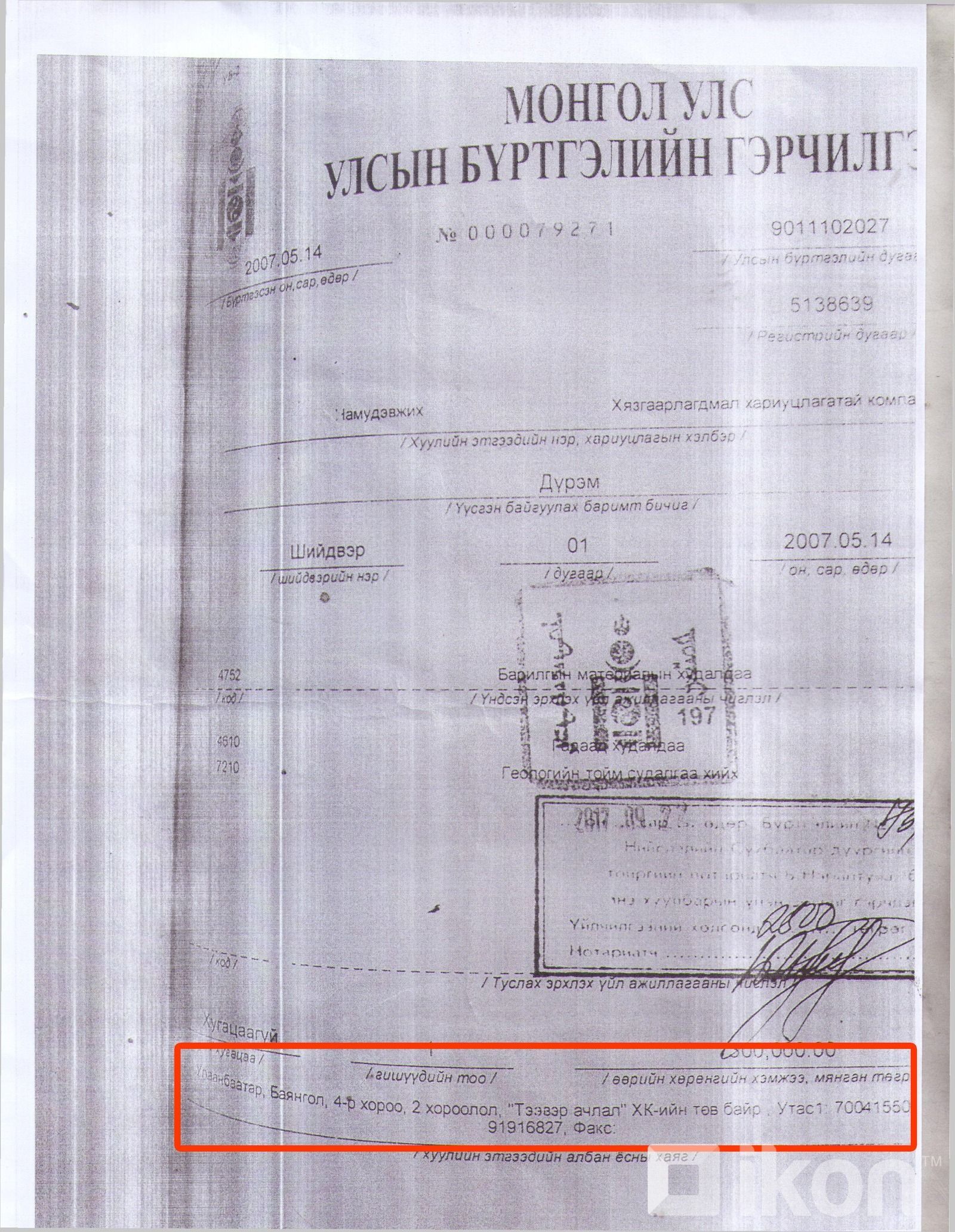 Баримт 2: Монголын Хөрөнгийн Биржид бүртгэлтэй "Тээвэр ачлал" компанийн хаяг болон "Наму Дэвжих" ХХК-ийн гэрчилгээн дээрх албан ёсны хаягтай ижил байна/