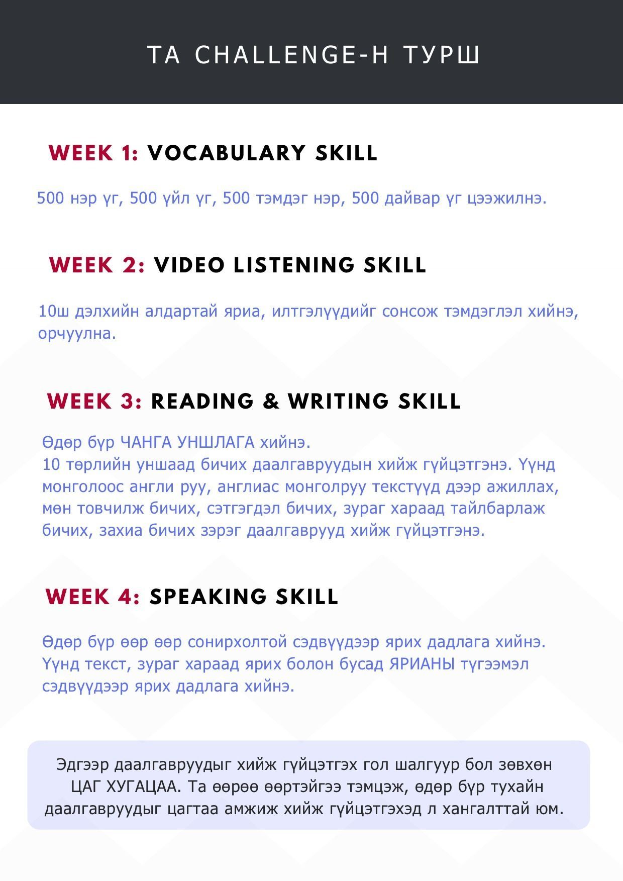 Харин даалгаврын хувьд VOCABULARY, LISTENING, READING & WRITING, SPEAKING гэсэн Англи хэлний 5 үндсэн чадваруудад төвлөрч бодитой үр дүн гаргах маш өгөөжтэй даалгавруудыг бид илгээх болно. Ингэхдээ 7 хоног бүр нэг чадвар дээр төвлөрнө.
