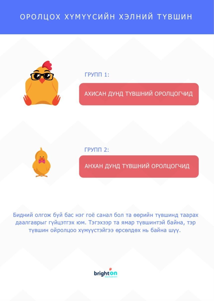 Аа мөн, та миний түвшин хүрэх болов уу яах бол гэж санаа зоволтгүй. Учир нь бид 2 өөр төрлийн түвшин бэлдсэн тул та өөрийн таарах түвшинд оролцох боломжтой.