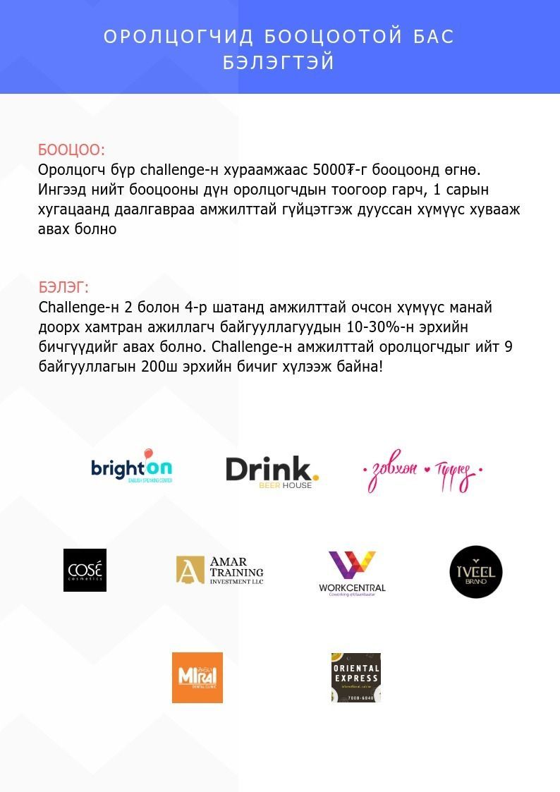 Манай challenge-н оргил хэсэг бол яахын аргагүй БЭЛЭГ бас БООЦОО. Та даалгавраа яг цагт нь оруулж явсаар 1 сарын дараа танд нийт бооцооны мөнгө хувааж найрлах болон манай хамтран ажиллагч байгууллагуудын 10-30%-н эрхийн бичгийн эзэд болох боломж нээгдэнэ. Татгалзах аргагүй санал байгаа биз?