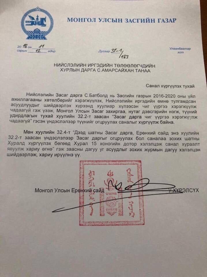 Мөн үүнтэй холбогдуулан Су.Батболдыг огцруулах албан бичгийг үйлджээ.