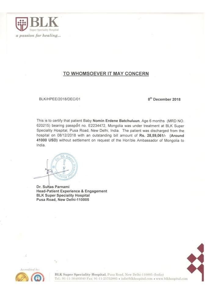 Харин энэ талаар Элчин сайд Г.Ганболд “Иргэн Б.Батчулуун, Г.Оюун нар ЭСЯ-нд ирж, “Шинэ Дели хотын “BLK” эмнэлэгт цаашид охиноо эмчлүүлэхгүй, санал болгож байгаа эмчилгээг нь хийлгэхгүй, даруйхан нутаг буцахаар шийдлээ. Энэтхэгт байх визний хугацаа хэтэрсэн, торгуулийн хэмжээ их болоод байгааг хөнгөлүүлж, хилээр гарах зөвшөөрөл олгож тусална уу” гэж хүссэн.