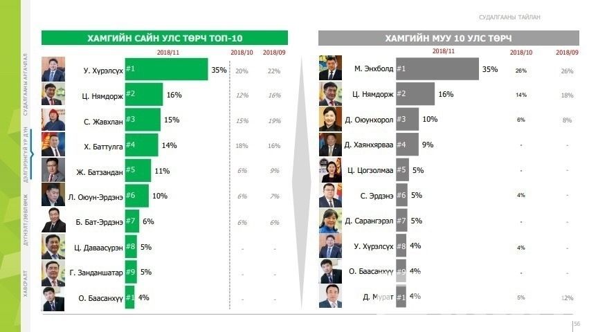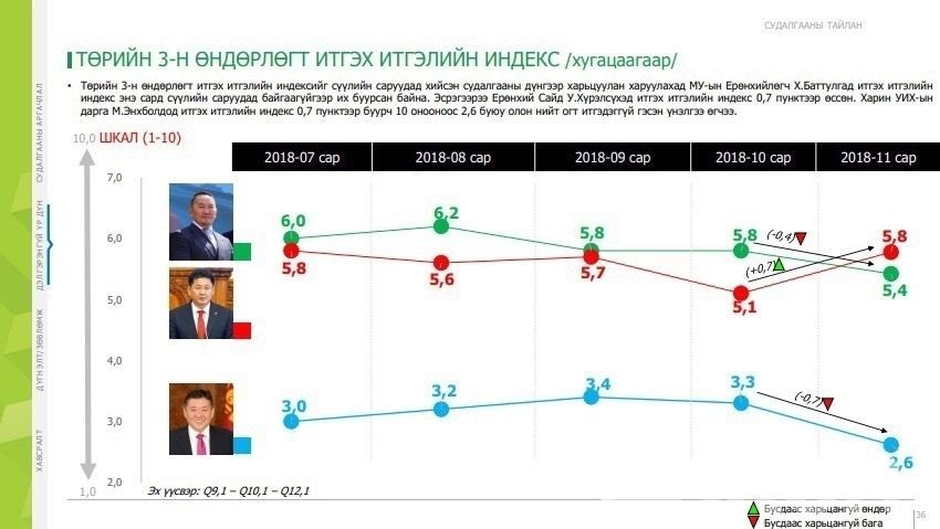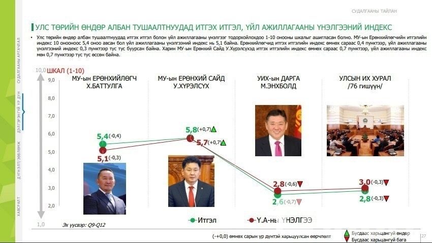 Харин улстөрчдийн рейтингийг харвал намын рейтинг нь доошилсон ч даргынх нь өссөн дүр зураг харагдаж байна. Судалгааны эх сурвалж: MMCG
